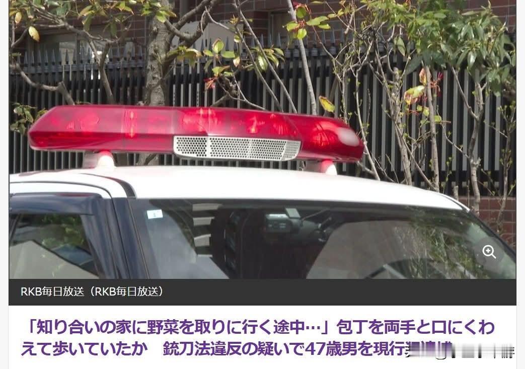 “要去朋友家拿菜”?日本佐贺男子双手持刀、口衔菜刀逛大街,遭警方依违反枪炮刀剑法现行犯逮捕! 25日上午,佐贺县唐津市发生一起离奇案件。一名47岁无业男子因无正当理由携带三把刀具,被警方以违反《枪炮刀剑法》(枪炮刀剑管制法)现行犯逮捕。 事件经过:民众目击“三刀流”男子 - 时间:25日上午约8点半。 - 地点:佐贺县唐津市二子(Futako,地名日文音译)。 - 报案:一名路过的女性发现一名形迹可疑的男子持有刀具,随即拨打110报警,称“路上有个男的拿着刀”。 逮捕现场:口中竟然还含着一把刀 当警察赶到现场时,发现该名男子: - 两手各拿一把长约13.5厘米至18厘米的菜刀。 - 口中竟然还衔着一把菜刀。 男子就这样带着三把刀在路上行走,警方随即以涉嫌违反《枪炮刀剑法》将其制服并逮捕。 嫌犯供词:否认犯罪行为 被逮捕的是家住附近的47岁无业男子。面对警方讯问,他竟然给出了一个令人困惑的理由: - 供词:“我只是在去朋友家拿蔬菜的路上。” 目前他否认有违法意图,警方正针对其精神状态与具体动机展开调查。 (新闻源自日媒,仅供参考)