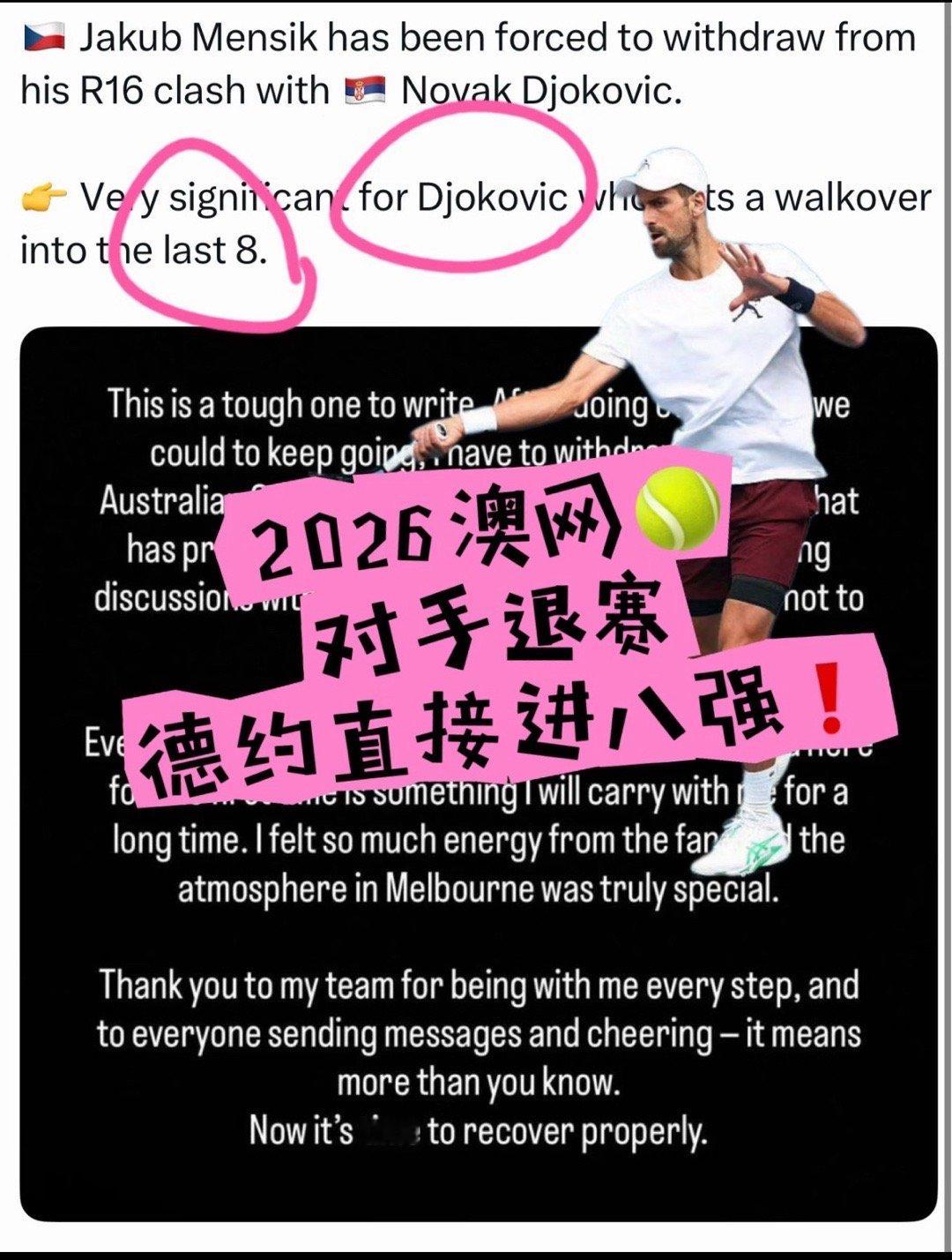 德约科维奇收退赛礼晋级澳网八强 2026澳网门希克因腹部伤势退赛,德约不战而胜晋级,错失复仇迈阿密赛之役,静候穆塞蒂与弗里茨胜者。