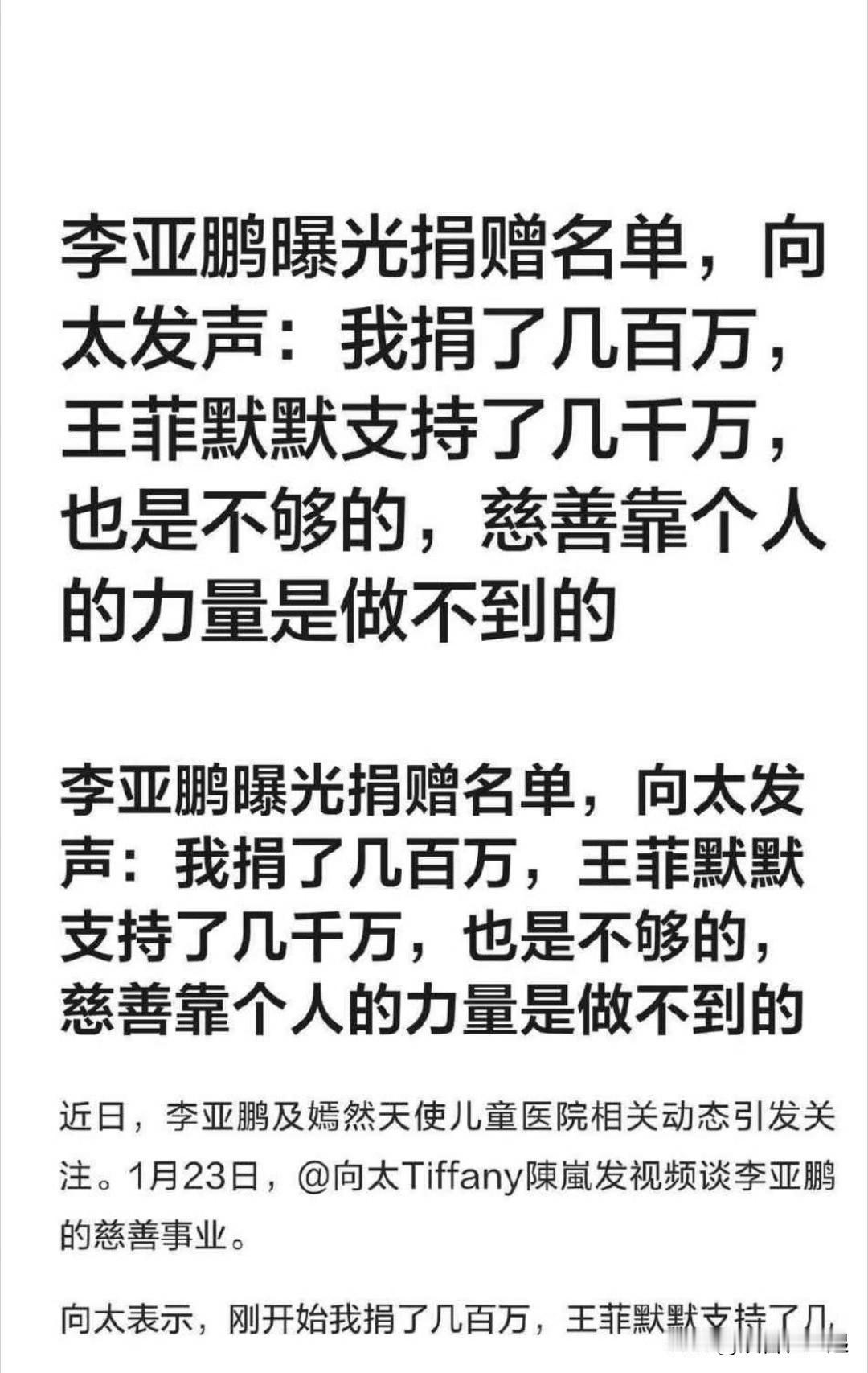 向太又开始“火力全开”了,这次喊话李亚鹏放过自己。李亚鹏刚靠27万网友捐款解决嫣然医院欠租危机,向太就戳破真相。 她可不是蹭热度,早年还捐过400万,见证其十七年公益路,资助11000多例唇腭裂手术。 向太指出核心问题,医院租金占比远超安全线,靠募捐不是长久之计。李亚鹏晒明星捐赠名单回应,却难掩运营硬伤。向太建议让专业人管专业事,像李连杰的壹基金那样。27万捐款人大多是捐100块以内的普通人。 做公益不能只靠情怀,要懂变通,放过自己也不是放弃。 李亚鹏