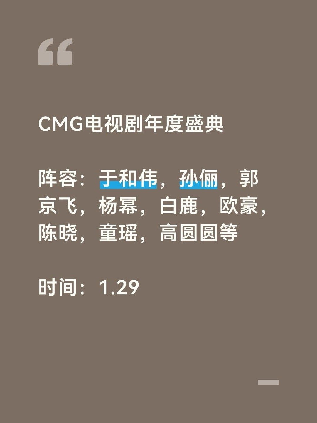 盛典🍉CMG电视剧年度盛典阵容:于和伟,孙俪,郭京飞,杨幂,白鹿,欧豪,陈晓,童瑶,高圆圆等时间:1.29