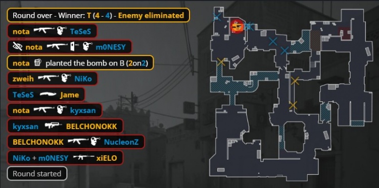 回到长枪局,孩神埋伏CT家箱子看中路双杀后掉狙,随后Niko与核爆哥各杀一个,时间耗尽,上帝拿到孩神大狙三杀难拿分。次回合龙哥中路绕后刀掉上帝,nota站住B点单局三杀扳平比分。