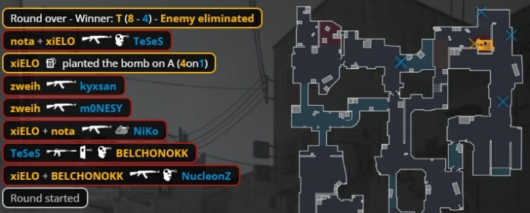 全场终局,猎鹰倒数30s冲A小,zweih换掉K3,核爆进A下包,KK平台双杀,nota再杀核爆哥,Niko残局1v3无力回天被nota击杀,PV以13-11赢下图二拿到赛点!