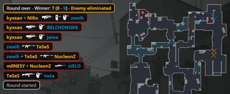 第4回合Jame读透猎鹰防守阵型放空B点,带队轻松进B下包再拿一分。次回合猎鹰枪械不全,上帝再次带队进B下包得手,B门磕枪上帝大狙轰掉双杀的Niko,zweih收掉孩神,PV扳平比分。