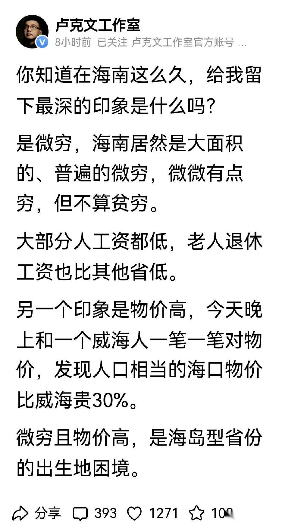 一个大V来我们海南调研,回去发了篇文章,里面有个词,叫“微穷”。 他说采访了一个渔民,得出一个结论:儋州渔民,不喜欢吃鱼。 我一个土生土长的儋州人,看到这就坐不住了。我爸,一个八十多岁、跟海打了一辈子交道的老渔民,听完我念叨这事,把手里的茶杯往桌上轻轻一顿。 他说,不喜欢吃?那是吃不着。 我爸说的,是五九年到六一年那阵子。那时候的鱼,多到什么地步?退潮了,就在岸边扑腾,人下到水里,光用手都能直接捧回来。 但岸上站着人,眼睛就直勾勾盯着海面。谁都不许下海。 有那饿得顶不住的,半夜偷偷划着小船出去,捞回来的鱼,脚刚沾到沙滩,就被全部收走。家里人,一口鱼汤都喝不上。 这不是喜不喜欢的问题,这是脖子上悬着一把尺子。有些事,你站在几十年后,隔着一层玻璃去看,是看不真切的。 再说那个“微穷”。 他去的那个农场,就在我们儋州的山区里,交通不方便,人也少,确实不富裕。可拿一个点,就概括一整个岛? 我们这地方,一件短袖能穿大半年,一双拖鞋踩遍全城,出门的成本几乎没有。房前屋后,撒把种子自己就能长出菜,山里的野果伸手就能够着。 这种日子,你说算富,还是算穷? 一个地方到底怎么样,不是外人走马观花看几天,采访一两个人,就能下定义的。 你得亲自在这片太阳底下晒过,被这里的台风吹过,才知道生活真正的滋味。