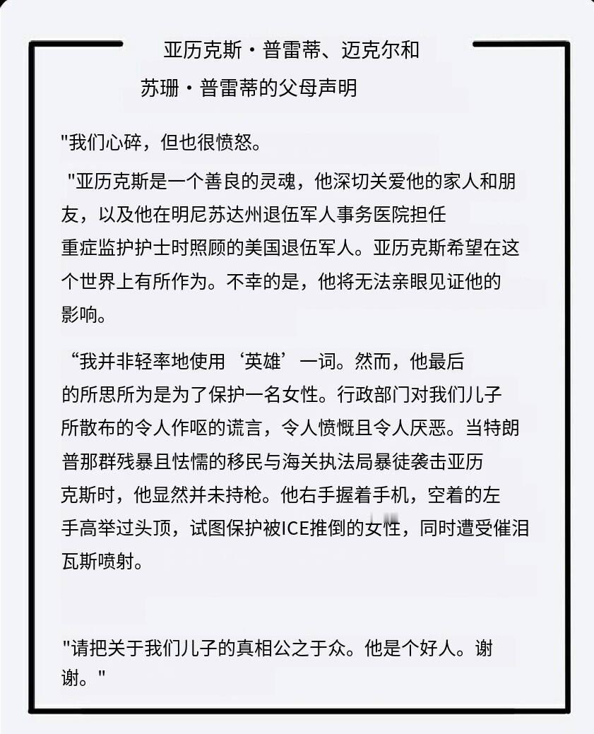 新闻快讯——明尼阿波利斯联邦执法枪击事件升级 遇害护士家属发声驳斥官方说法 2026年1月,美国明尼阿波利斯市发生联邦执法人员枪击平民事件,当地VA医院ICU护士亚历克斯·普雷蒂(Alexander Pretti)遭边境巡逻人员枪杀。事件引发强烈社会反响,参议员伯尼·桑德斯于社交平台转发普雷蒂父母的声明,家属在声明中悲愤控诉政府的“谎言”。 声明指出,亚历克斯当时正试图保护一名被移民与海关执法局(ICE)人员推倒的女性,他右手持手机、左手高举,全程未持有武器,却遭胡椒喷雾喷射并被枪杀。家属强烈谴责官方对事件的歪曲描述,呼吁公众还原真相,证明亚历克斯是一个善良且致力于帮助他人的人。 这已是明尼阿波利斯当月发生的第三起联邦执法枪击案,当地民众已发起大规模抗议,市长与州长均要求联邦执法人员撤离并停止在该市的移民执法行动,事件仍在持续发酵中。