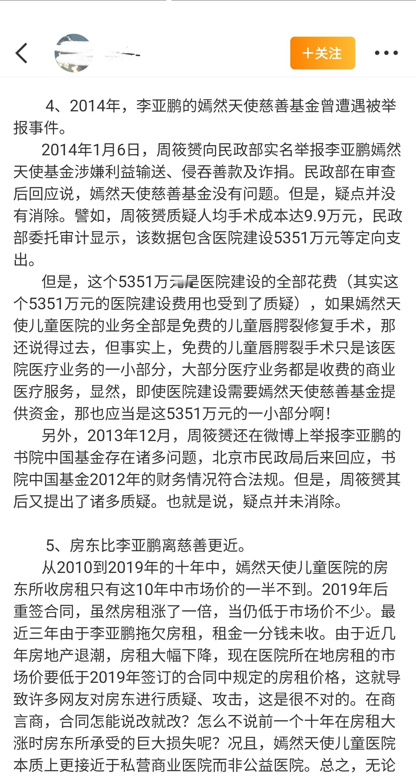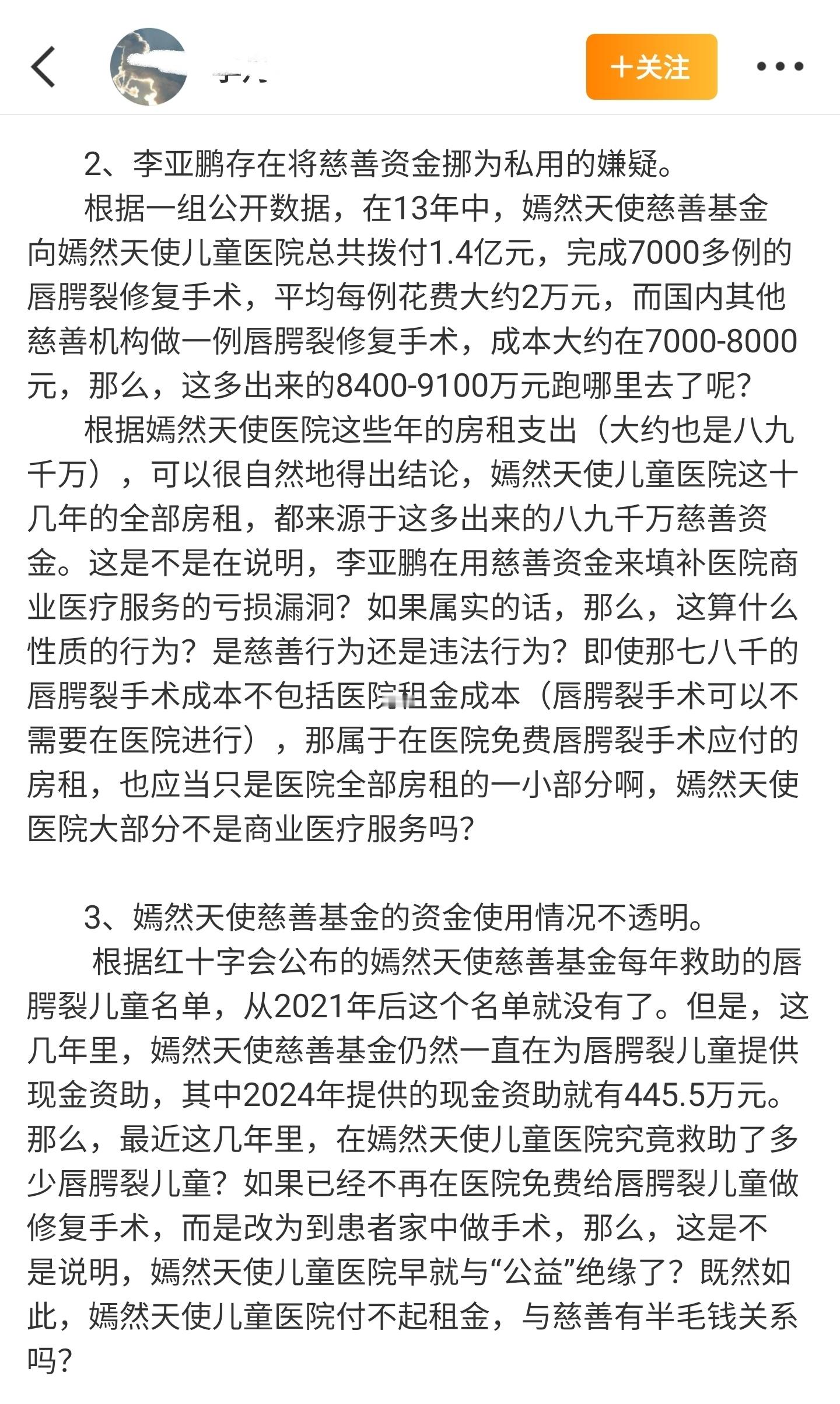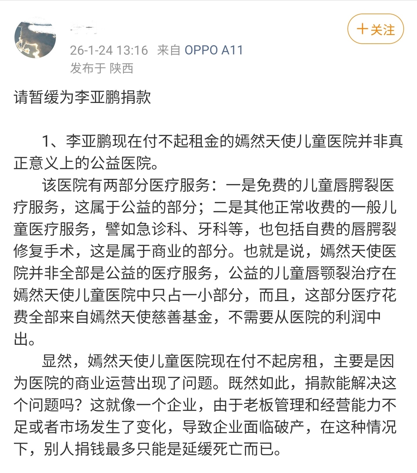 有网友呼吁别给李亚鹏捐款。著名导演高群书导演直接转发谴责,这波我站高导。 人家李亚鹏不是为自己要钱,是为了那所救了上万孩子的嫣然天使儿童医院!16年啊,他死磕公益,带着医院做了1.1万例唇腭裂手术,7000多台全免费,自己负债卖房子都没动过一分善款。现在医院欠租要关停,孩子们没地方做手术了,网友自发捐款搭把手,怎么就有人跳出来拦着?你可以不捐,但别泼冷水、瞎质疑啊!李亚鹏没卖惨,没推卸责任,坦然承认“情怀大过能力”,还坚持站好最后一班岗做完手术。这样的人,值得敬佩。