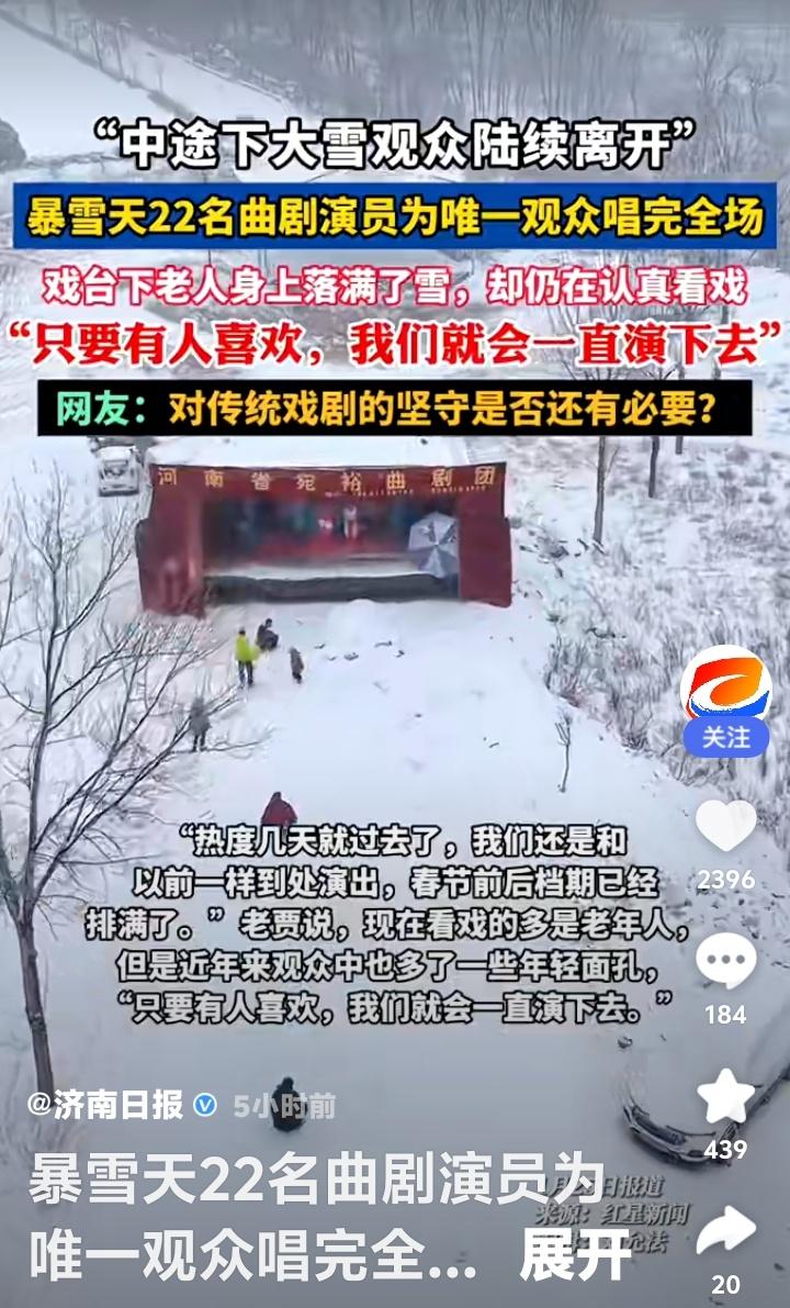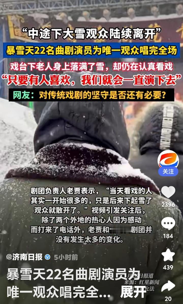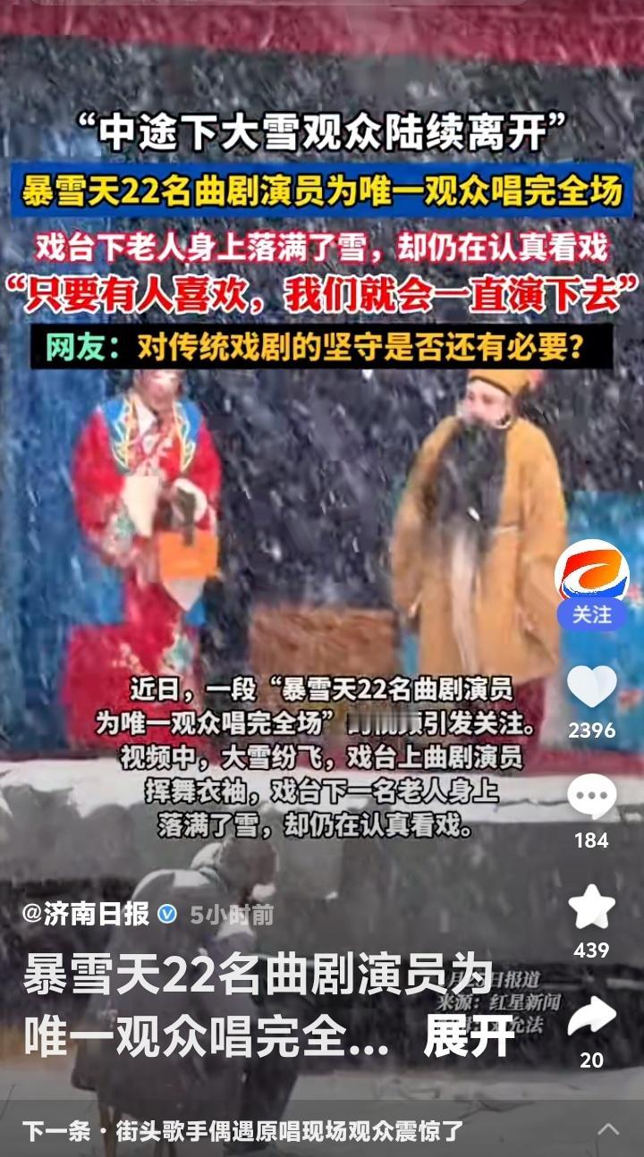 河南暴雪中戏台成孤岛!22名演员为台下唯一白发观众唱完全场,老人身披积雪纹丝不动,这一幕让全网破防! 鹅毛大雪席卷中原,露天戏台转眼成了风雪中的孤岛。台下本应座无虚席的长条凳,只剩下一位白发老人。他像一尊雕塑般坐着,肩头、帽檐积了厚厚一层雪,目光却始终牢牢锁在台上。而台上,22名曲剧演员水袖翻飞,唱念做打一丝不苟,铿锵之音穿透风雪。 这不是电影画面,这是前几天发生在河南某村镇的真实一幕。风雪愈狂,戏未停歇。演员们呵出的白气混着雪花,妆容被雪水浸湿,但每一句唱腔依旧饱满,每一个身段依旧到位。他们是在为谁而唱?仅仅为那一位几乎被大雪覆盖的老人。 剧团负责人老贾后来淡淡地说:“戏一开腔,就不能停。这是老祖宗传下的规矩,也是我们对这门艺术的敬重。”原来,那天演出前半场观众不少,大雪突至后人们才陆续散去。唯独那位老人,从始至终没有挪动过一步。 许多网友瞬间泪目。有人想起老话“戏台一搭,三界皆知;开嗓唱戏,八方来听”。演员敬的是心中艺魂,老人守的是骨子里的热爱。风雪中这场“一对一”的演出,仿佛是两个时代之间一场沉默而庄严的对话。 也有人心酸发问:传统戏曲是否真的走到了末路?但细看新闻会发现,这个剧团春节档期早已排满。老贾说,如今台下虽多是老人,可年轻面孔也渐渐多了。只要还有人愿意听,他们就会一直唱下去。 其实,真正打动人的,并非“坚守”的悲壮,而是那份超越功利的热忱。在流量至上的时代,这场风雪中的演出宛如一颗剔透的琥珀,封存着艺术最本真的模样——不为掌声,只为知音。哪怕知音仅有一人。 我们感动,是因为在快餐文化泛滥的今天,这种“笨拙”的执着显得如此珍贵。它让我们看到,总有一些东西比风雪更持久,比时间更坚韧。那是文化的根脉,是职业的操守,更是人与艺之间那份纯粹到极致的承诺。 那位雪中看戏的老人,或许就是传统文化在民间最坚实的底座。而台上那22个身影,则是飘摇时代里守护薪火的点灯人。他们不需要悲情的解读,他们本身就是答案:只要真心还在跳动,戏,就永远有人唱,也永远有人听。 (来源:根据红星新闻、宛裕曲剧团负责人采访及网络热议综合撰写) 传统戏曲 风雪坚守 文化传承