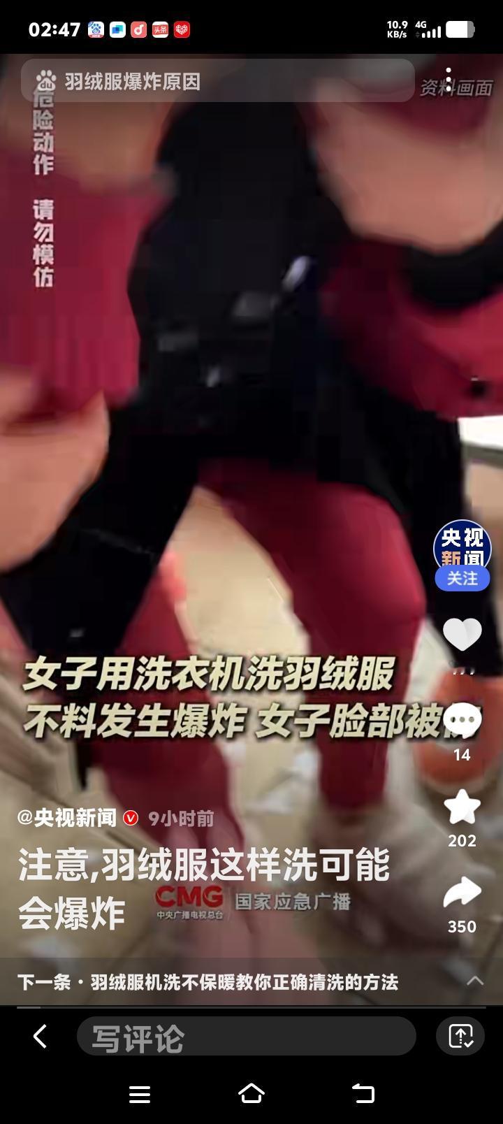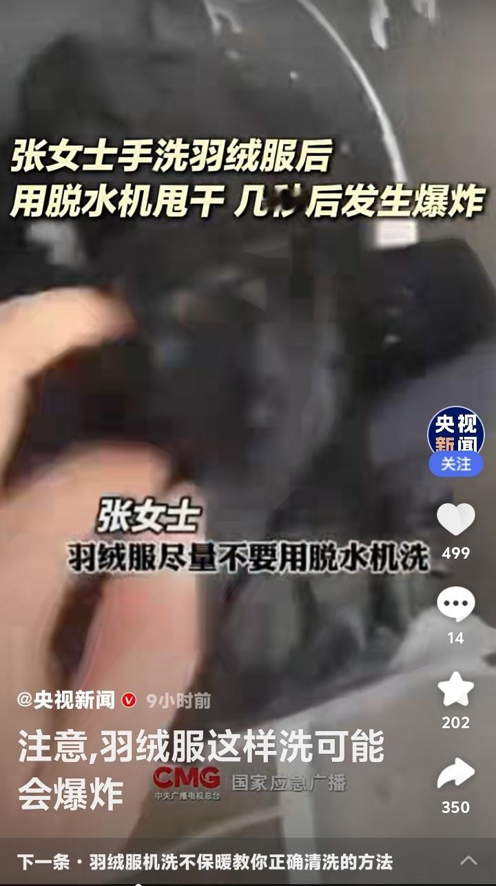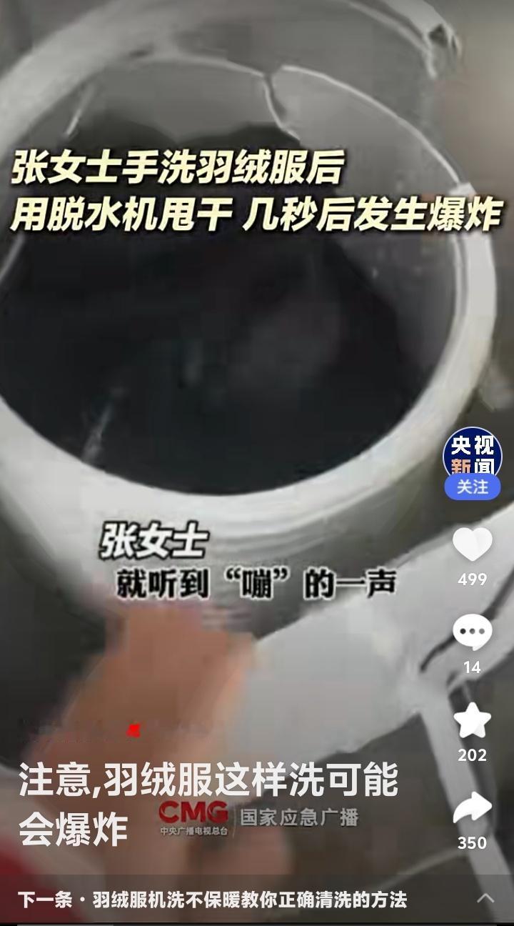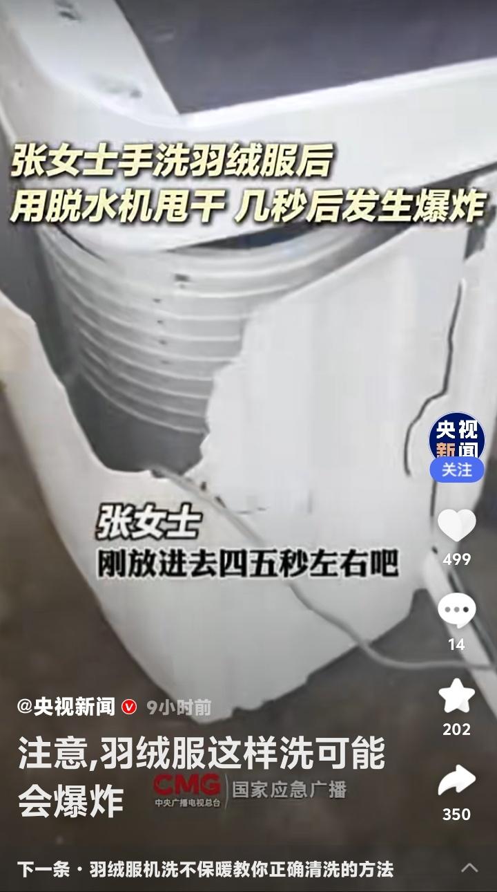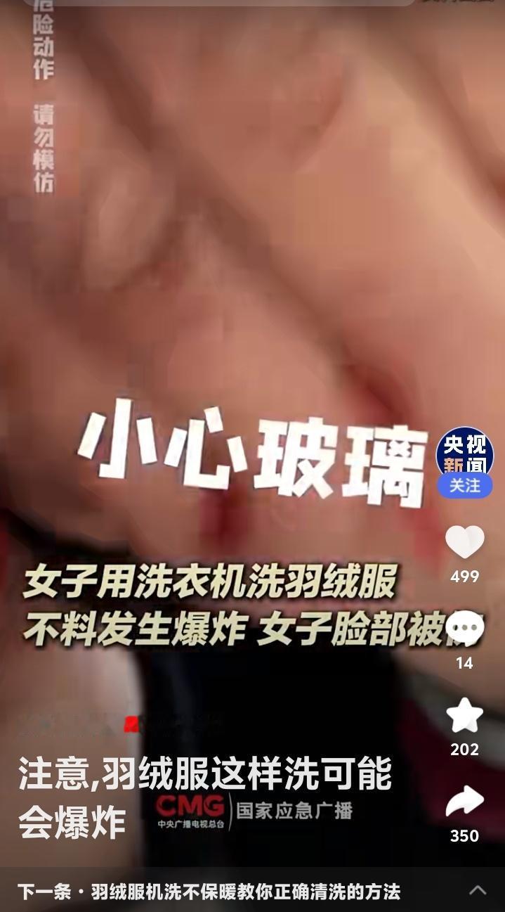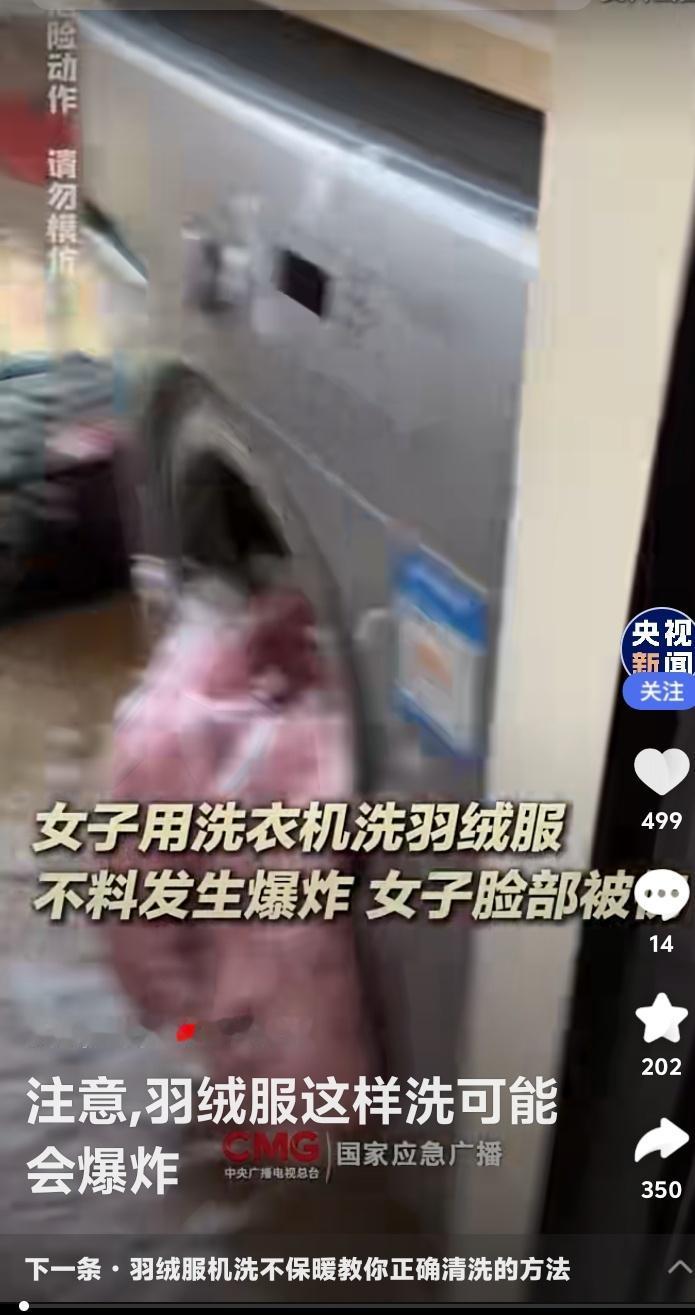 惊!央视紧急提醒:你家洗衣机正变身“炸弹”?羽绒服这样洗,女子脸部被炸伤,看完赶紧检查! 寒冬腊月,家家户户的羽绒服都进入了清洗季。可谁能想到,这看似平常的洗衣动作,竟暗藏“杀机”。近日,一则“女子用洗衣机洗羽绒服发生爆炸”的新闻冲上热搜,现场画面令人心惊。这不仅仅是个例,背后隐藏的安全盲区,可能正潜伏在你我身边。 想象一下,张女士只是将手洗后的羽绒服放入脱水机,短短几秒后,一声巨响伴随着四溅的碎片,瞬间击碎了日常的宁静。她的脸部受伤,洗衣机门被炸飞。这不是电影特效,而是真实发生的家庭安全事故。为何温暖的御寒神器,会变成危险的源头? 究其本质,问题出在羽绒服的特殊结构与洗衣机工作原理的致命冲突。优质羽绒服为防钻绒,面料常采用防水涂层,导致透气性差。洗衣机高速甩干时,羽绒吸水收缩,在滚筒内不断膨胀挤压。空气无法及时排出,在有限空间内压力剧增,就像一个不断被打气的气球,最终冲破束缚,引发爆炸。 尤其是一些老式双缸波轮洗衣机,脱水桶空间狭小且桶壁有孔,湿羽绒快速膨胀后,更容易堵塞侧孔,导致气体在短时间内急剧累积。而现代滚筒洗衣机如果未配备“羽绒服洗涤”专用模式,其强烈的搅拌和甩干力度,同样构成风险。这并非羽绒服或洗衣机的质量问题,而是物理规律下的必然风险。 看到这里,你是否心头一紧,想起自己也曾随手将羽绒服扔进洗衣机?评论区早已炸开了锅。有人后怕:“洗了十几年都没事,原来是运气好!”有人质疑:“这是真羽绒服才有的‘待遇’吗?”更有网友调侃:“这下好了,羽绒服爆炸成了检验真伪的另类标准。”这种普遍的侥幸与震惊,恰恰反映了常识的缺失。 那么,如何守护这份冬日温暖,避开潜在危险?关键在于“阅读”与“选择”。清洗前,请务必花三秒钟看一眼洗涤标签。若标明“不可机洗”,请乖乖手洗。若允许机洗,请确认你的洗衣机是否有轻柔的“羽绒服”或“户外织物”模式。这是科技赋予我们的安全钥匙。 手洗其实并不麻烦。用冷水浸泡,专用洗涤剂溶于30℃以下温水,软毛刷轻刷污渍,洗净后顺着纹理挤压水分,切勿拧绞。平铺或悬挂于阴凉通风处晾干。对于局部污渍,热毛巾蘸中性清洁剂擦拭,往往比整体水洗更护衣。这些小习惯,不仅能规避风险,还能大大延长羽绒服的使用寿命。 安全无小事,生活需智慧。一次爆炸,是偶然也是警示。它炸开的不仅是洗衣机的外壳,更是我们对日常风险的习惯性忽视。快过年了更得小心,洵哥欢迎读者转发分享这份提醒,不仅是为了保护一件衣服,更是为了保护我们最爱的人和那个辛苦经营的家。这个冬天,让温暖真正安全地包裹你我。 (来源:央视新闻、国家应急广播、羊城晚报等媒体报道综合整理) 羽绒服清洗 生活安全