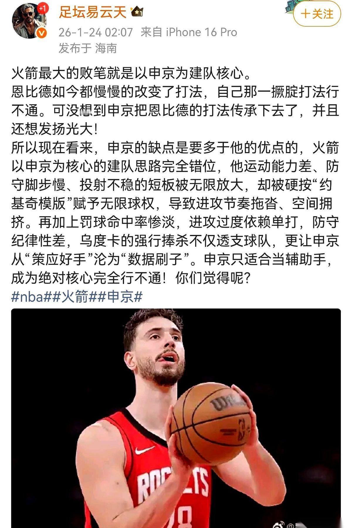 连恩比德自己都快放弃的“一撅腚”打法,休斯顿火箭队却捡起来,当成了建队法宝,硬塞给申京。 球一到他手里,全队四个人的进攻就地熄火,只能站着看他一个人在低位拱。进攻时间一秒秒被磨掉,最后仓促出手。 最拧巴的是,球队一边喊着要把他打造成下一个“约基奇”,给他无限开火权。可约基奇是传球大师,他这儿却把进攻路线堵得死死的。 防守端更是灾难。对方后卫一个简单的加速,他就被甩在身后三米远,留下的防守空当,队友跑断了腿都补不上。罚球线上的命中率,更是看得人直摇头。 主教练乌度卡这场豪赌,直接把一个原本不错的策应中锋,硬捧成了一个数据好看、但球队便秘的“伪核心”。 说白了,你不能让一个工兵去干将军的活。他打得累,全队跟着输。