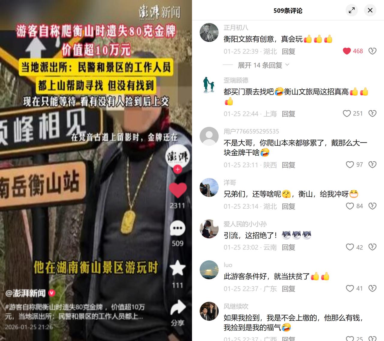 衡山丢10万金牌?这套路比山道还绕! 广西游客称在衡山梵音古道遗失80克金牌,价值超10万,帽子叔叔和景区搜遍无果,大家清一色喊剧本。 别纠结谁在演,这背后是文旅圈的老套路,抛个高价值遗失物钩子,精准抓住大众寻宝捡漏的小心思,靠舆论发酵带客流。留言里买门票去找的调侃,刚好踩中套路的命门。 有意思的是,涉事景区本身客流一直稳居前列,压根不愁没人来。这种消费信任的操作,短期可能赚一波眼球,可等真有人丢了东西求助时,谁还会当真? 狼来了的戏码,演多了,最后凉的是自己的口碑。