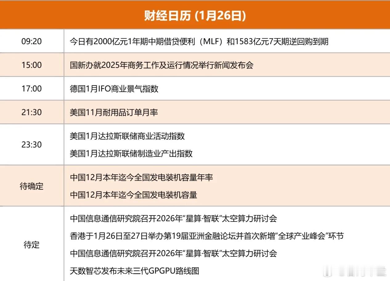 1.26股市早知道:1、外盘汇总:小涨小跌,如图一。 2、交易提示:如图二。 3、财经日历:如图三。 4、三大指数:1)大盘:继续看涨2)创指:新目标34703)科创50:兑现1500,再看1588 5、重要新闻:1)证监会进一步扩大期货市场开放品种范围,新增确定14个期货期权品种为境内特定品种;2)“赴港上市门槛收紧”传闻不实,境外上市政策没有变化。 6、市场动态:1)北京市将全面实施“人工智能+”行动,建设国家人工智能应用中试基地;2)报道称三星电子将一季度NAND价格上调100%;3)《酒泉市商业航天产业发展规划(2026—2035年)》正式发布;4)意优科技“全球首条机器人关节自动化产线”在浦东投产。 7、公司公告:1)嘉美包装、锋龙股份:自1月26日开市起停牌核查;2)龙韵股份:筹划购买愚恒影业58%股权,股票停牌;3)海目星:2025年预亏8.5亿元到9.1亿元;4)香农芯创:2025年净利同比预增82%-135%,企业级存储产品销售数量增长;5)先导智能:2025年净利同比预增424%-529%;6)中微半导:2025年净利同比预增107.55%左右;7)永杰新材:拟购买奥科宁克秦皇岛100%股权和奥科宁克昆山95%股权,预计构成重大资产重组;8)八一钢铁:预计2025年净亏损18.5亿元-20.5亿元,股票可能被实施退市风险警示。