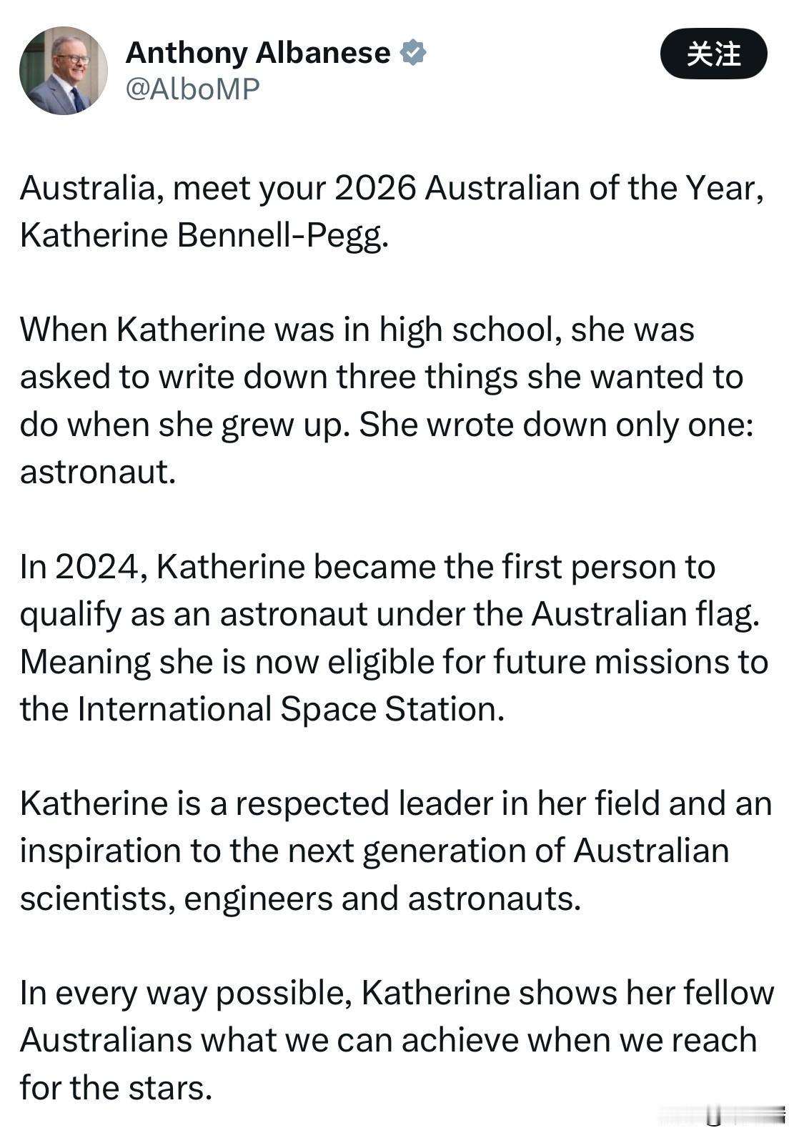 宇航员、空间工程师凯瑟琳·本内尔-佩格(Katherine Bennell-Pegg)已正式获选为 2026年度澳大利亚人物(2026 Australian of the Year)。 首位澳洲旗帜宇航员:她在2024年从欧洲航天局(ESA)毕业,成为澳大利亚历史上首位获得正式资格并在澳大利亚国旗下受训的宇航员。 航天工业先驱:目前担任澳大利亚航天局(ASA)的空间技术总监。 STEM教育倡导者:她利用这一平台激励年轻一代(特别是女性)追求科学、技术、工程和数学(STEM)领域的职业,并经常向学生进行科普演讲。 颁奖时间:2026年1月25日,在堪培拉国家植物园举行的颁奖典礼上宣布。 获奖意义:评审团称赞其为澳大利亚新兴航天工业的开拓者,通过她的努力,为澳大利亚参与前沿人类探索开启了新的大门。