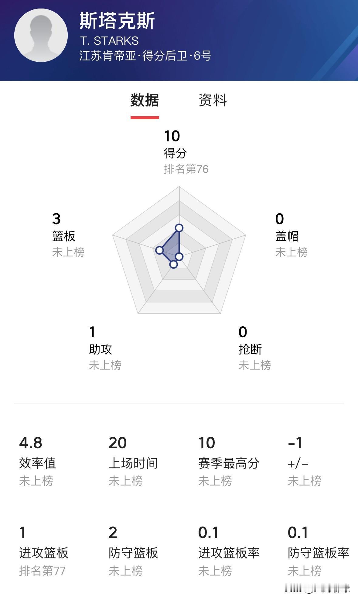 江苏男篮新外援仅一场比赛就看出上限,昨晚江苏男篮新签外援斯塔克斯随队客场对阵宁波男篮,全场出战20分钟仅拿到10分3篮板1助攻,命中率11投仅4中,效率太低,标准的普通本土后卫数据,虽说只是首秀,但从临场表现来看,绝不是布朗、史密斯、里勒、韦瑟斯庞等这种得分机器,当然了,还是希望这位新外援能尽快打出高水平的表现,尽快帮庞峥麟分担后卫线的压力!