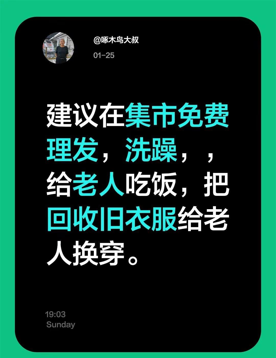 我评论了@山东毛豆 的作品:建议在集市免费理发,洗躁,,给老人吃饭,把回收旧衣服给老人换穿。