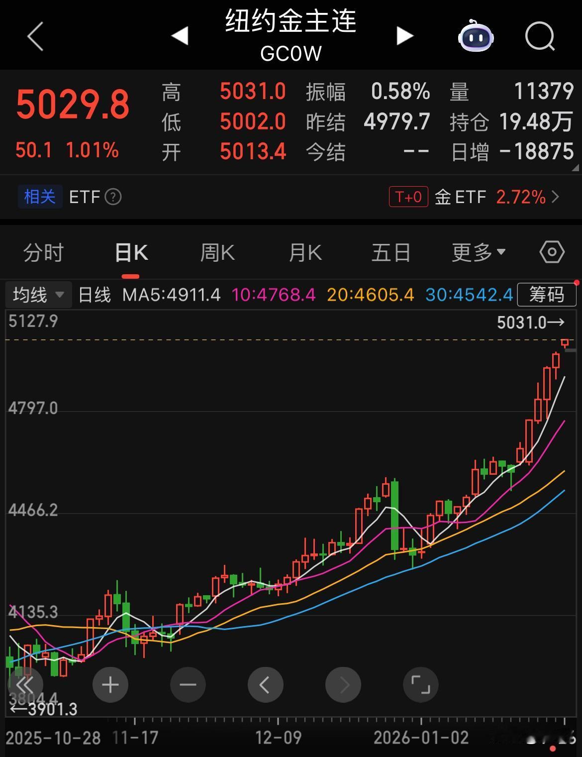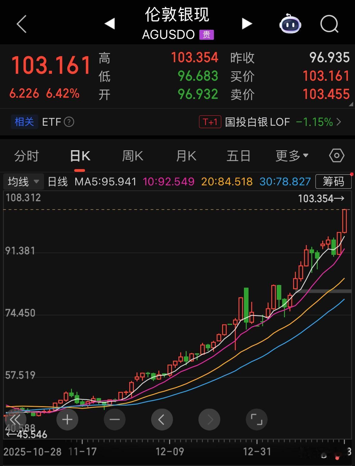 黄金现货站上5000美元大关,创历史新高,现价5030美元/盎司; 白银现货站上100美元大关,创历史新高,现价103美元/盎司。