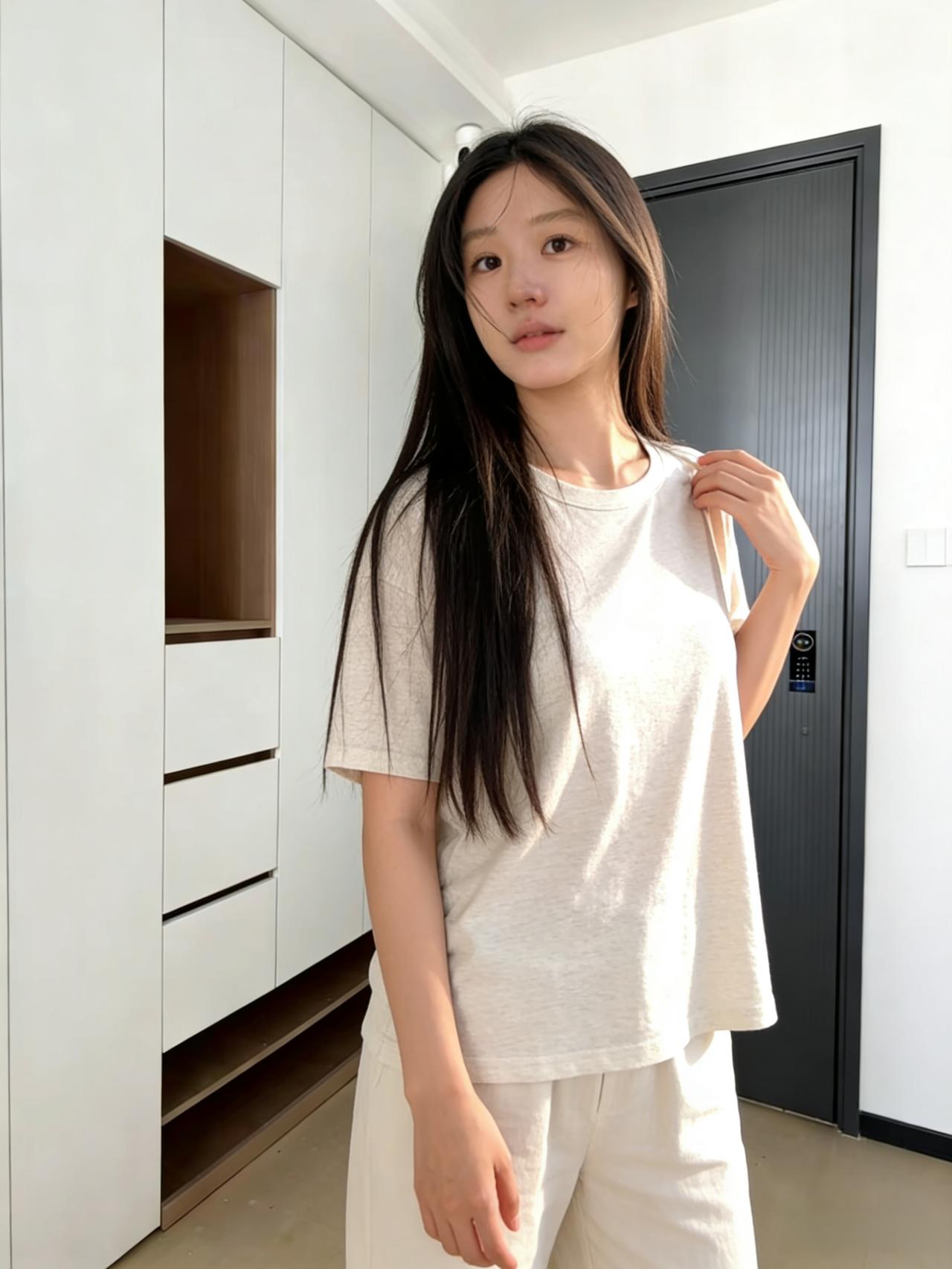 白柜黑门映晓光,佳人闲立态清扬。 浅衫漫衬身姿软,长发轻垂眉黛长。 目带星河凝远意,身依静室卸繁妆。 寻常居家皆诗意,不藉丹青绘锦章。