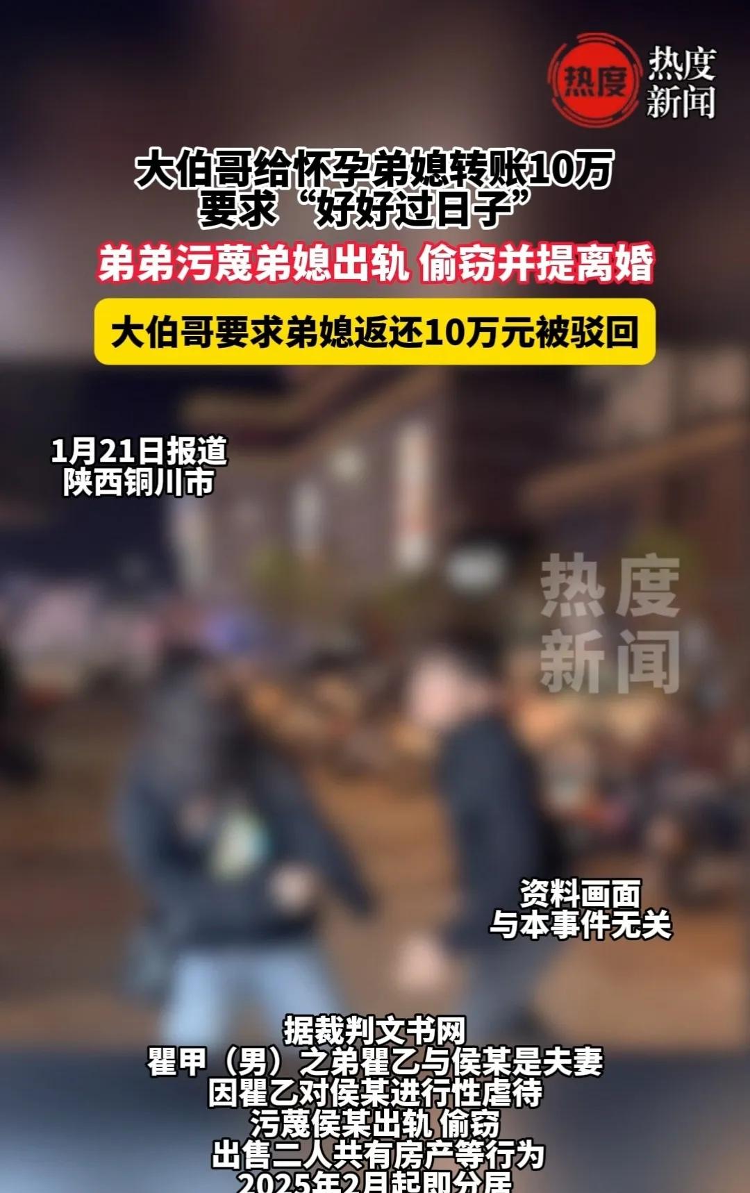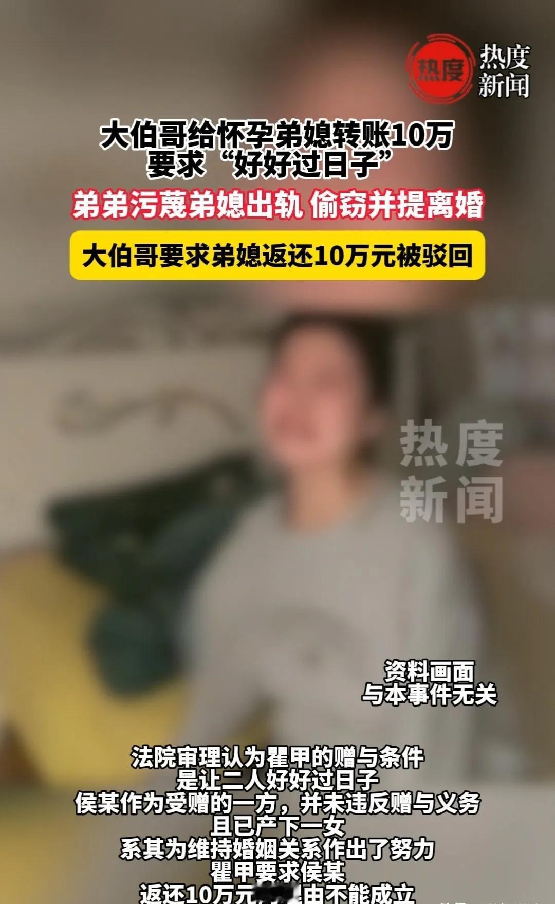 陕西铜川,一女子都怀孕了,丈夫却对她性虐待,诬陷她出轨,偷窃,想卖掉婚房,就是为了离婚。大伯哥给了女子10万,让她好好跟自己弟弟过日子,可女子生下女儿后,夫妻还是走到了离婚的地步,大伯哥一看,立马把女子告上法庭,让她返还10万,女子:凭啥?要离婚的是你弟,不是我,我已经履行了好好过日子的承诺。法院的判决出乎意料。 瞿先生有个不省心的弟弟,叫小瞿。 小瞿最近夫妻俩闹离婚,即使弟媳妇侯女士都怀孕了,两人闹得不可开交。 长兄如父,作为大哥,瞿先生不能不管不问,因为他知道弟弟什么德行,如果离了婚,可能这辈子再也没有女人愿意嫁给他了。 于是,思来想去,为了安抚弟媳侯女士,让她好好跟自己弟弟过日子,瞿先生直接塞给侯女士10万块钱。 在瞿先生看来,自己弟弟不务正业,上班也迟到早退,都敢跟自己上司吵架,然后被炒了鱿鱼。 肯定是自己弟弟挣不来钱了,贫贱夫妻百事哀,弟媳才不想跟他过了,自己赠予10万,可能就平息了他们的夫妻矛盾,然后慢慢再进行开导。 侯女士也不客气,接了这10万赠予,但她也顾不上家丑不外扬了,她告诉瞿先生,要离婚的是他弟弟,不是自己。 而且,小瞿卑鄙到什么程度,他为了达到离婚的目的,竟然不顾她有孕在身,对自己进行性虐待,还诬陷她出轨,偷他东西。 侯女士感觉很愤怒,她一个孕妇,出什么轨?她一心一意跟小瞿过日子,没这个心思,再说了,谁会看上一个孕妇呀? 而且,小瞿还想把婚房卖掉,拿走卖房款,即使丈夫这么不堪,侯女士还是不想离婚,毕竟孩子要出生了,她不想孩子一出生就没了父亲,在单亲家庭成长。 瞿先生听了弟媳说完也忧心忡忡,自己弟弟就是一个吊儿郎当的人,竟然不珍惜婚姻,还有这个为他生儿育女的女人,如果他离婚了,下半辈子就打光棍吧,哪个女人会愿意往他这个火坑跳? 所以,瞿先生去劝自己弟弟小瞿,可小瞿鬼迷心窍了,充耳不闻,一意孤行,夫妻俩在2025年4月,还闹到了派出所。 2025年10月份,侯女士生下女儿,两人还是走到了离婚的地步,瞿先生一看,弟弟和弟媳要分道扬镳,竟然厚着脸皮找到侯女士,让她把自己给的10万还回来。 侯女士真是生气呀,丈夫不是个东西,她本以为大伯哥通情达理,没想到,他也好不到哪里去,给了10万还要要回去。 离婚后,她们母女生活无以为继,都是拜小瞿所赐,他这个大伯哥不心存愧疚,反而做出这样的事来。 侯女士拒绝还钱,她声色俱厉的告诉瞿先生,提出离婚的是他弟,不是自己,自己是想跟他弟好好过日子的,她已经履行了当初的赠予承诺,凭啥还? 瞿先生一看侯女士不给钱一不做二不休,直接撕破脸,把她告上法庭。 这瞿家兄弟俩的做派,真是让人忍不住吐槽。小瞿简直就是个渣男,妻子怀孕期间,不心疼爱护也就罢了,还性虐待、诬陷出轨偷窃,甚至想卖婚房离婚,完全不顾妻子和即将出生的孩子,毫无责任感和道德底线。 瞿先生呢,一开始想拿10万让弟媳和弟弟好好过日子,出发点或许是好的,可弟弟那德行哪是10万能改变的。 等弟弟弟媳真离婚了,他又厚着脸皮要回这10万,这不是出尔反尔嘛,把弟媳当什么了。 侯女士在这段婚姻里太无辜太可怜了,遭遇丈夫的种种恶行,还努力想给孩子一个完整的家。 离婚后生活艰难,大伯哥却来落井下石。得让这种不讲情义、没有担当的人知道,做人得有良心,不能光想着自己的利益。 还好,最终法院判决,侯女士不用把10万还给瞿先生。 对此,你怎么看?
