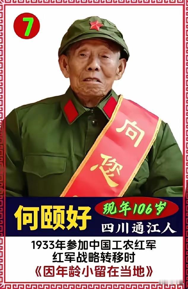 老兵不死,只是凋零!现在健在老红军仅剩11人,那些曾用双脚丈量二万五千里、用血肉筑起新中国的人,正在以肉眼可见的速度凋零。最大108岁,最小102岁,这11位老人,是活着的历史,也是我们与长征、与烽火岁月之间,最后一根鲜活的纽带。 开国少将王扶之12岁参加红军,从黄土高原打到天山脚下;唯一健在的女红军王全英,10岁就跟着红四方面军爬雪山过草地,如今在成都安度晚年。他们的皱纹里刻着湘江战役的血色,白发里藏着雪山草地的风霜,每一道年轮都是一部浓缩的中国革命史。 我们未必知道这11位老人是谁;我们享受着和平年代的红利,却常常忘了,眼前的安稳是他们用命换来的。当年红军将士平均年龄不到20岁,每前进1公里就有3名战士倒下,而这些幸存的老人,正是那场奇迹的活证据。 当你抱怨生活不易时,想想他们啃着皮带过草地的日子;当你纠结个人得失时,想想他们为了家国抛头颅洒热血的决绝。他们的存在,不是为了让我们感动,而是为了让我们明白:今天的一切,从来都不是理所当然。 信仰不是口号,是雪山草地里的不离不弃;初心不是标签,是枪林弹雨中的一往无前。当他们最终走入历史,我们能做的,就是把他们的故事讲给更多人听,让红色基因在代代相传中永不褪色。 别等他们都走了,才想起欠一句谢谢;别等历史模糊了,才想起要守护初心。记住这11个名字,记住他们的故事,就是对老红军最好的告慰!毕竟,真正的英雄,永远不会被遗忘。
