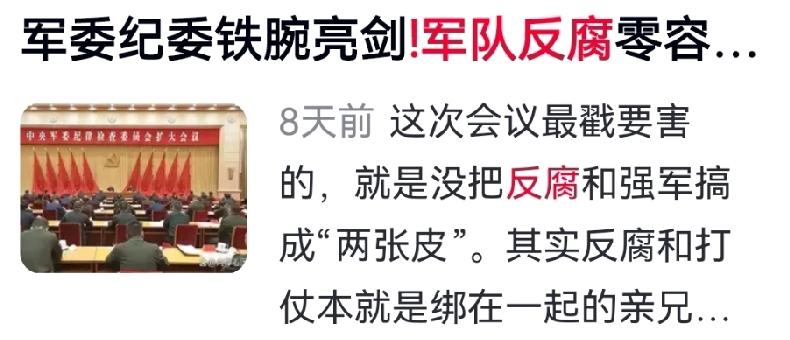 军营反腐,挥的是利刃,斩的是毒瘤,护的是家国安宁! 军费是军队的命根子,却总有心术不正者把它当成“摇钱树”,损公肥私、纸醉金迷。历史血迹未干:北宋禁军腐败,百万之众不堪一击;北洋水师军费被挪用,亚洲雄师灰飞烟灭。腐败,是战斗力最致命的杀手。 如今形势复杂,外部虎视眈眈,绝不能让腐败成为敌人的突破口。必须坚持无禁区、全覆盖、零容忍,无论“虎”“蝇”,一查到底。反腐是为战力赋能,让每一分军费都落到实处,让官兵一心谋打赢。 这次军队反腐的硬气,让我们看到了守护国防的决心,也让我们对人民军队更有信心。只有始终保持反腐的高压态势,始终守住清廉的底线,人民军队才能永远是让敌人胆寒、让人民安心的钢铁长城。 对此你怎么看?