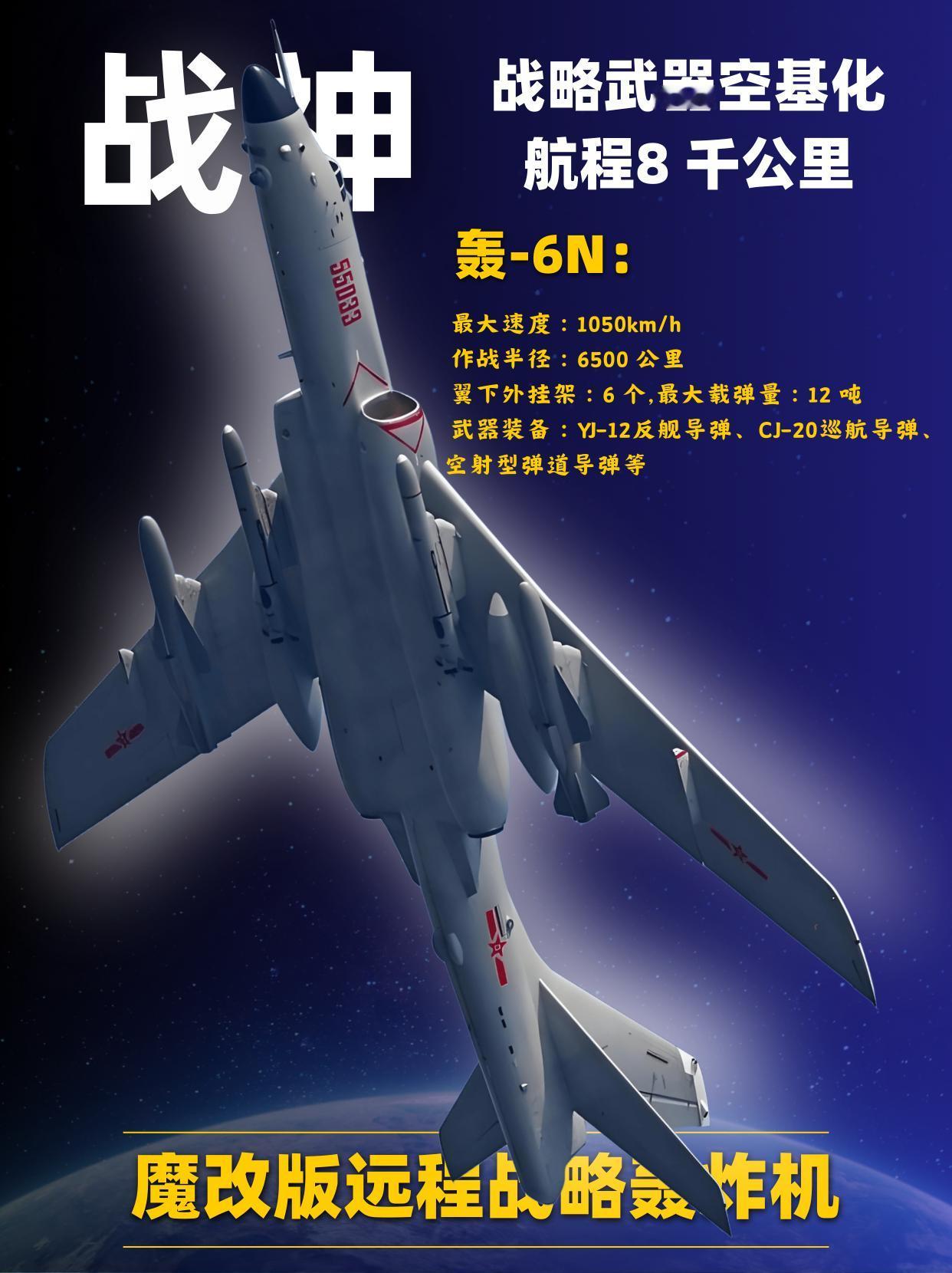 战神魔改轰 - 6N:空基战略威慑的硬核担当! 作为轰-6家族的魔改型号,轰-6N 带着空中受油管和重载挂架登场,把咱们的空基战略威慑能力往前推了一大步。 ①从参数上看,它航程 8 千公里、作战半径 6500 公里,最大速度 1050km/h,翼下6 个挂架能扛12 吨弹药,鹰击-12、长剑-20 这些弹种都能挂,最狠的是机腹那半埋挂架,能塞空射弹道导弹,这可是实打实的战略级杀器。 ②轰-6N的出现,本质上是咱们在现有平台上挖潜的典范,没搞花里胡哨的,就是把够用、好用、顶用做到极致,让老平台焕发新战力,这种务实思路挺值得琢磨的。 未来随着新一代轰炸机的推进,轰-6N仍会是过渡阶段的核心力量,继续撑起空基战略威慑的半边天。