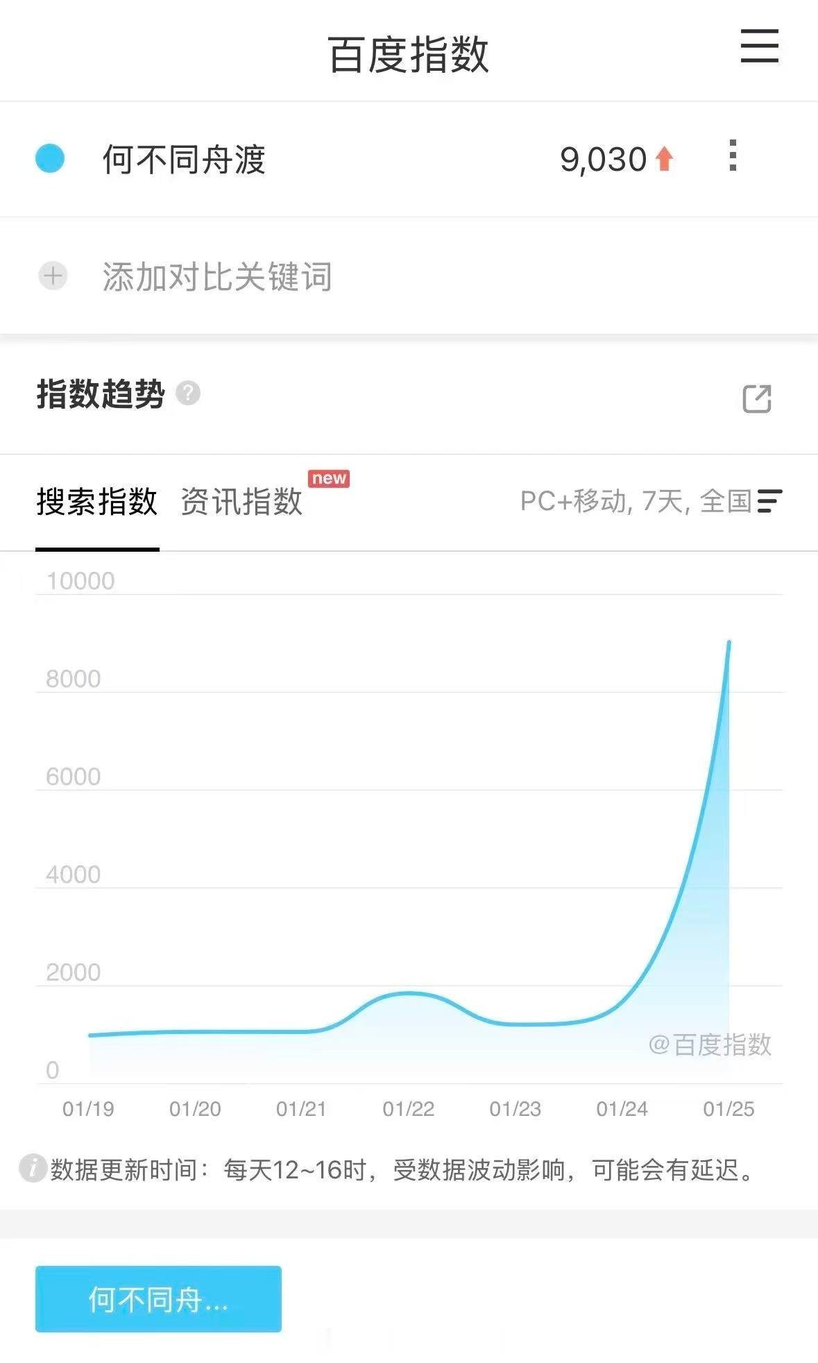 何不同舟渡檀健次《何不同舟渡》开机百指和微指。《何不同舟渡》百指破9000,微指破千万,上涨1253倍,檀健次强大的影响力和号召力🈶