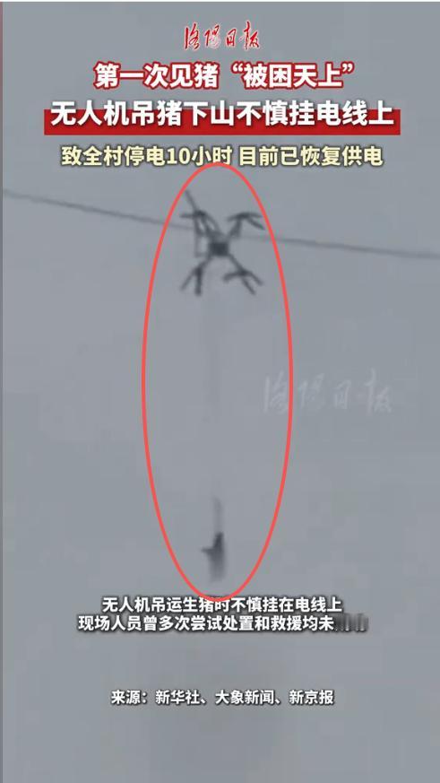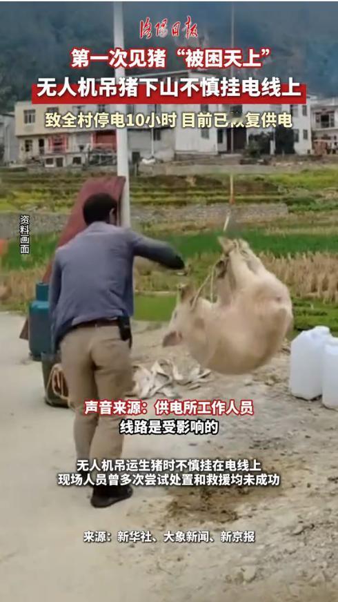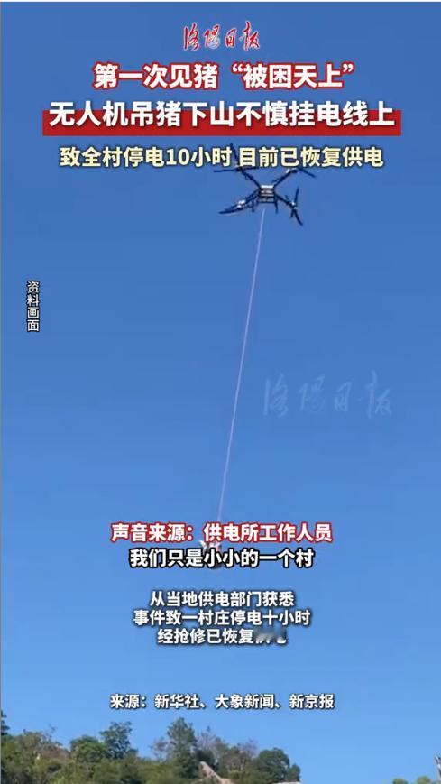 “离了个大谱!”1月24日,四川巴中,一村民突发奇想用无人机将十几头猪调到山下杀年猪,没想到由于天太黑,第一头猪升空后就直接挂在了电线上,几人赶紧抢救却导致全村直接断电10个小时。网友:笑不活了,猪真的上天了! 随着科技的发展,无人机的用途也越来越广泛,不同类型的无人机其用途也不同,比如有的可以用来摄影,有的可以用来运东西,但是用无人机运活猪的也是第一次见。 随着新年将近,加上最近的年猪宴特别火热。这个村子村民便也想办一下年猪宴热闹一下。于是他们就在山顶的养猪户家买了十几头猪。可是由于杀猪宴是在山下办的,这样把猪运下山却成了难题。 思来想去后,一男子想到可以用家里的无人机把猪吊起来运到山下,这样就省力了。于是他对比了无人机的最大承载力和猪的最大体重,发现计划可行后,就招呼大家伙一起干起来。 他们先将猪用绳子捆好,然后将绳子另一端绑在无人机上,就这样吊起来起飞了。成功升空后,大家都很开心,以为稳操胜券了,结果不曾想猪”升空后,飞到一半,就不动了——原来是天太黑,根本看不清,导致无人机挂到了电线杆上。 几人便合力拿杆子挑,不曾想这一操作直接让整个村子停电了10个小时。同村其他村民得知停电原因后感到无奈又好笑,纷纷吐槽,活了这么多年,也是见到猪在天上飞了! 信息来源:《猪不仅能上树还能上天!无人机吊运年猪挂在电线上,致全村停电10个小时猪无人机 停电