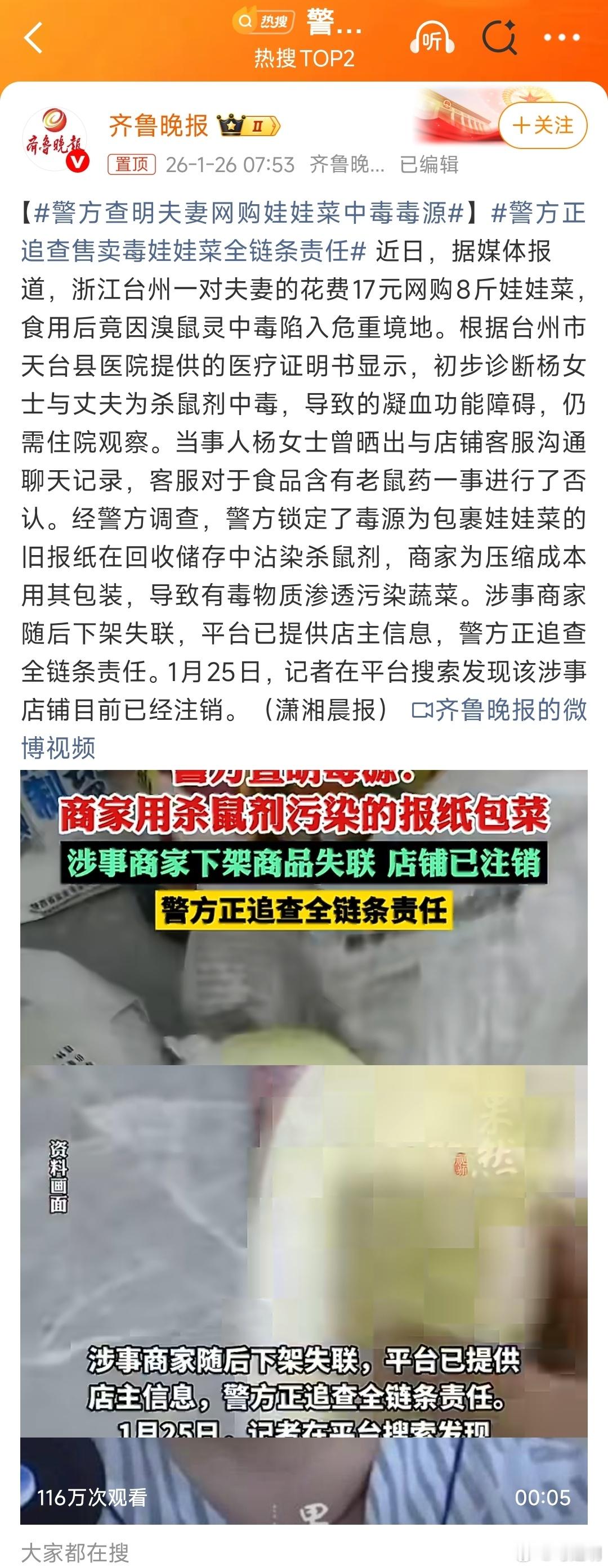 警方查明夫妻网购娃娃菜中毒毒源警方正追查售卖毒娃娃菜全链条责任 据媒体报道,浙江台州一对夫妻的花费17元网购8斤娃娃菜,食用后竟因溴鼠灵中毒陷入危重境地。根据台州市天台县医院提供的医疗证明书显示,初步诊断杨女士与丈夫为杀鼠剂中毒,导致的凝血功能障碍,仍需住院观察。互联互通时代,更应重视食品安全。