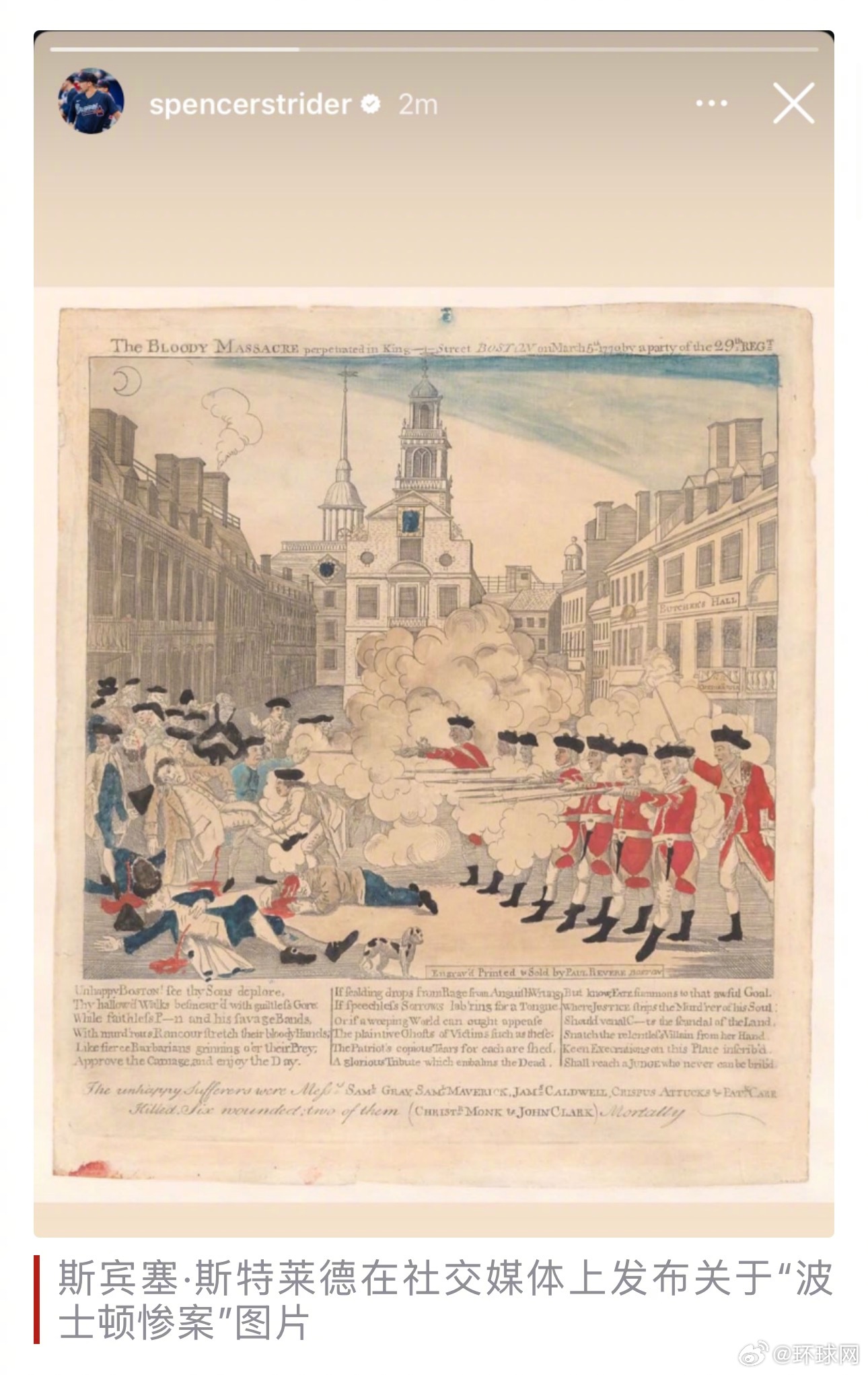 #美国棒球明星发波士顿惨案图# 【明尼苏达州再次发生联邦执法人员枪杀居民事件,美国棒球明星发“波士顿惨案”图片引关注】不到一个月内,明尼苏达州接连发生两起联邦执法人员开枪致美国公民死亡事件,美国民众对特朗普政府移民政策的不满愈演愈烈。在这种背景下,有不少美国网民将移民海关执法局(ICE)等部门人员的“暴力执法”比作“波士顿惨案”,以表达对一系列事件的不满与谴责。“波士顿惨案”发生于1770年,在英国位于北美的殖民地波士顿,英国军队与当地民众间发生流血冲突,该事件被认为是引发美国独立战争的导火索之一。据雅虎新闻网报道,24日枪击事件发生后,美国职业棒球联赛亚特兰大勇士队的明星投手斯宾塞·斯特莱德在社交媒体上发布了一张图片,图片内容正是250多年前发生的“波士顿惨案”,画面中英国士兵正在向当地民众开枪。据报道,斯特莱德此前曾多次公开批评特朗普政府的政策。据报道,除斯特莱德外,还有其他多名美国体育明星对在明尼苏达州发生的事件表示强烈谴责,美国知名女子篮球运动员布里安娜·斯图尔特在25日比赛的球员介绍环节举出“废除ICE”标语。在谈到她为什么这么做时,斯图尔特说,“昨天一整天,我都对在社交媒体和新闻上看到的一切都感到厌恶,我们这里的每个人都有这种感觉,或多或少。”美国民主党籍众议员塞思·莫尔顿此前也将联邦政府执法人员的暴力行为比作“波士顿惨案”。他说1月13日称,“ICE杀害了一名美国公民,向试图驾车逃离的女子连开数枪的联邦执法人员应该受到起诉。国土安全部部长诺姆的作秀助长了这种无法无天的局面,她应负有责任。她纵容在街上枪杀一名手无寸铁的美国母亲,仅凭这一点就足以将她解职。”莫尔顿说,“马萨诸塞州人民至今仍记得波士顿惨案,当时那些想成为美国国王的人在公共街道上枪杀平民,而那场悲剧至今在明尼苏达州重现。”本月7日,美国移民与海关执法局人员在明尼苏达州最大城市明尼阿波利斯市抓捕非法移民时,开枪打死美国公民古德,引发全美多地举行抗议活动,反对暴力执法。明尼阿波利斯24日上午再次发生移民执法枪击事件,造成一名37岁的美国男性公民死亡。这一突发事件导致当地紧张局势进一步升温,联邦政府与地方政府分歧进一步加剧。