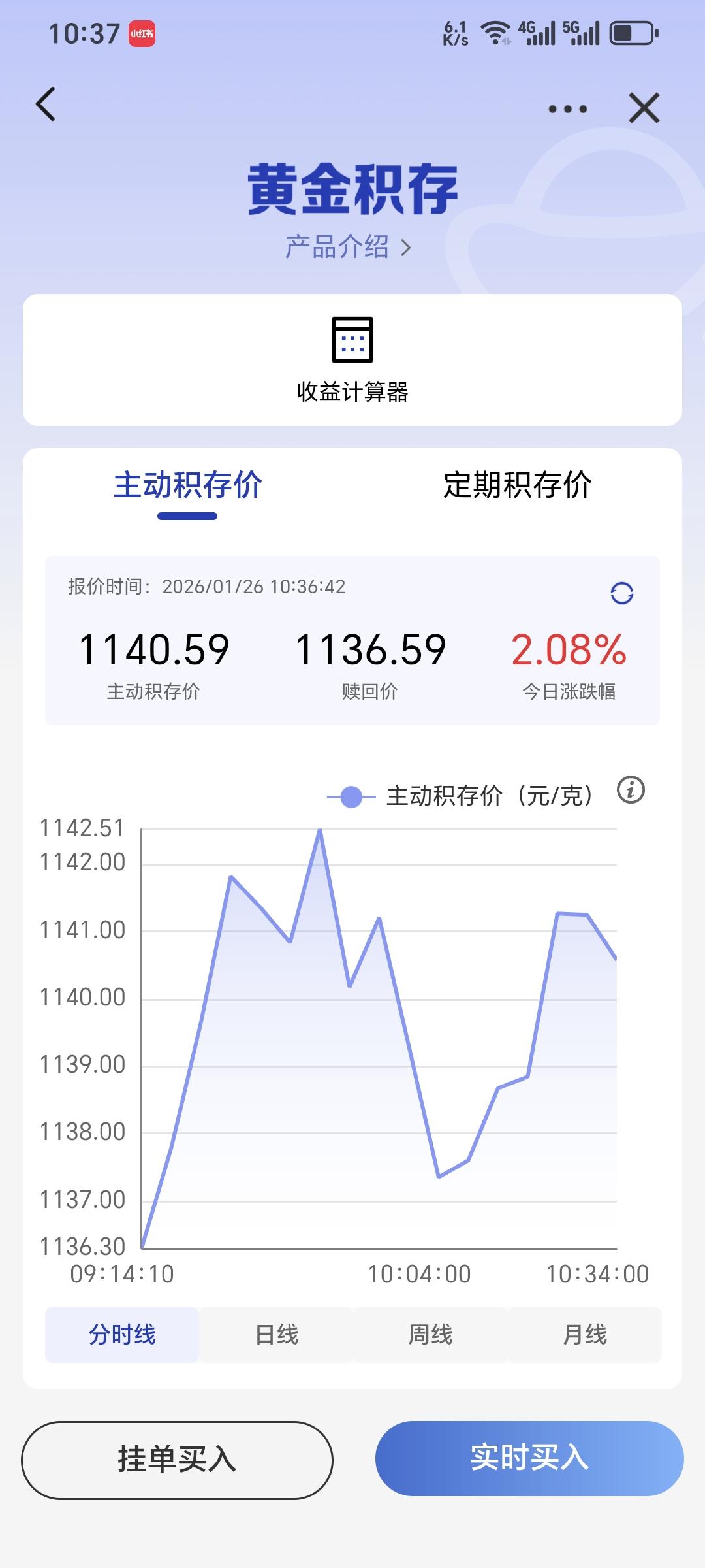 周一开盘你踩不准节奏 周五(1月24日)晚上,建设银行积存金晚上是1118元/克收盘,没怎么下跌。总以为这太高,今天周一一开盘,直接1135元/克。在9点44分,达到1142.51元。 这是第三次重复的故事,隔周突涨17元。 假如你星期五在1118入手,今早直接每克赚24.51元。 有谁敢在周五买了,今天高位套现的?我相信有这样的高手。