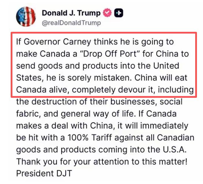 脸面都不要了!特朗普今天发文说:“这个世界最不需要的,就是让中国吞并加拿大。这事绝不会发生,连一丁点可能性都没有!感谢各位关注此事。” 这番话毫无逻辑支撑,无视基本地理常识与国际交往准则,纯属凭空捏造的臆想,本质就是为了博眼球、造话题,妄图搅乱中加持续回暖的合作大局。 稍有常识便知,中加隔太平洋相望,无领土争端、无核心利益冲突,多年来始终以平等互利为原则深耕合作。 不久前,加拿大总理卡尼时隔多年访华,双方敲定经贸合作路线图,签下农产品贸易、清洁能源开发等多项协议,在贸易便利化上达成共识。 这般实打实的共赢合作,本是主权国家的正常交往,却被特朗普强行扣上“吞并”的帽子,离谱程度令人咋舌。 加拿大的发展诉求其实很明确:摆脱对单一市场的依赖,寻求多元合作。此 前,加拿大对美出口占比超八成,长期的单一依赖让其经济发展处处被动,甚至多次遭遇他国政客无视其主权的调侃。 近年来,这一局面正在改变,加拿大与中国、欧盟的贸易往来持续升温,尤其在能源、农业领域,合作深度与规模不断突破。 中加合作的互补性,在加拿大小城基蒂马特的蜕变中体现得淋漓尽致。 这座不列颠哥伦比亚省的无名工业小城,曾深陷资源优势难以转化的困境。而中加液化天然气合作项目落地后,一切迎来转机。 中国企业以合理股份参与开发,不仅激活了当地的天然气资源,更带动上下游产业链发展,创造了大量就业岗位。 当地原住民也借此融入项目,打破发展瓶颈,小城经济活力被彻底点燃。 当地管理者多次表态,感谢中国企业带来的资金、技术,让资源优势真正变成了发展优势。 这样的双赢合作,却被特朗普恶意歪曲,实在荒唐。 农业领域的合作,更是中加互利共赢的生动注脚。 加拿大油菜籽、大豆等农产品品质优良,急需广阔市场;中国拥有庞大消费群体,对优质农产品需求旺盛。 双方一拍即合,贸易往来愈发紧密,还持续优化检验检疫、物流运输等流程,推动贸易便利化。 卡尼总理访华时,更是敲定了农产品合作新细节,让加拿大农产品能更顺畅地进入中国市场。这种邻里般的特产互通,在特朗普眼中竟成了“吞并前兆”,逻辑之混乱令人费解。 特朗普此时抛出离谱言论,核心原因的很直白:看不惯加拿大走独立的外交与经济路线,更忌惮中加合作打破其掌控区域资源、贸易格局的野心。 在他的固有思维里,周边国家就该依附于自己,而加拿大寻求多元合作、中加深化互利往来,无疑触碰了他的利益蛋糕。 于是,他故技重施,用捏造“威胁论”的老套路挑拨中加关系,妄图逼加拿大重回依附轨道,本质就是想让一切发展都围着自己的利益转。 这套制造话题、混淆视听的手段,特朗普早已驾轻就熟,此前就多次拿邻国主权说事,即便遭拒也乐此不疲。 而西方部分势力也常戴有色眼镜看待中国合作,将正常投资污蔑为扩张,将留学曲解为渗透,无视中国始终秉持的平等互利原则,无视中国为当地创造的就业与机遇,无视合作给双方民众带来的实惠。 当今世界,经济全球化潮流不可阻挡,各国相互依存度日益加深,没有国家能独善其身。 每个主权国家都有权根据自身需求选择合作伙伴,加拿大寻求多元发展、中加开展正常合作,都是顺应时代潮流的正当选择,绝非任何不实言论能抹杀的。 国家交往,平等尊重是根本,互利共赢是王道。特朗普的荒诞言论,最终只会沦为国际社会的笑柄。 谁在推动合作、谁在制造矛盾,明眼人自有判断,中加合作的步伐,也绝不会被这种闹剧所阻碍。