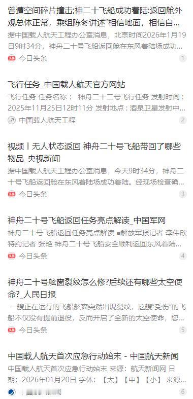 美国急坏了:中国为什么遮住神舟20的舷窗?有什么不想让人看到? 麻烦看官老爷们右上角点击一下“关注”,既方便您进行讨论和分享,又能给您带来不一样的参与感,感谢您的支持! 2025 年 11 月初,神舟二十号航天员在返回前的最后例行检查中,发现返回舱舷窗出现了三角形贯穿裂纹。经初步判定,这是被不到 1 毫米的太空微小碎片撞击所致,且碎片直接击穿了舷窗最外层的防热层,这一突发状况让原定的载人返航计划被迫按下暂停键。 神舟二十号早在 2025 年 4 月 24 日就从酒泉卫星发射中心发射升空,顺利与空间站完成对接,此次原本按计划执行返回任务,却因太空碎片的意外撞击遭遇险情。任务总指挥部第一时间组织专家开展研判,综合评估后果断叫停载人返回,迅速启动航天应急响应预案。 很多人不知道,神舟飞船的舷窗并非单层结构,而是由三层玻璃复合而成,最外层的防热窗要抵御返回大气层时超千摄氏度的高温烧蚀,此次受损的正是这一层,直接影响了载人返回的安全系数,这也是指挥部做出紧急调整的核心原因。 预案启动后,航天团队的应急行动迅速落地,神舟二十一号早已于 2025 年 10 月 31 日发射升空,成为转移航天员的关键载体。2025 年 11 月 14 日,神舟二十号乘组顺利搭乘神舟二十一号返回舱安全落地,全程仅用 20 余天完成人员转移。 人员安全返回后,解决神舟二十号的舷窗问题成为重点,2025 年 11 月 25 日,神舟二十二号在酒泉卫星发射中心点火升空,这次发射是中国载人航天工程立项以来的首次应急发射,全程仅用 16 天完成箭船测试、总装等一系列工作。 神舟二十二号此次的核心任务,就是将专门研制的舷窗裂纹处置装置送上太空。因舱外维修的可行性极低,航天团队最终确定舱内加固方案,航天员在神舟二十号返回舱内完成装置安装,有效提升了舷窗的防热和密封能力,为后续无人返回筑牢基础。 在完成舷窗加固和一系列在轨试验后,神舟二十号的返回计划被重新提上日程。2026 年 1 月 19 日 0 时 23 分,神舟二十号撤离空间站,以无人状态开启返程,此次返程采用了 5 圈快速返回模式,是该模式首次在神舟飞船无人返回任务中应用。 当天 9 时 34 分,神舟二十号返回舱稳稳降落在东风着陆场,经现场检查,返回舱外观总体正常,舱内的下行物品状态良好,这场历经两个多月的应急处置任务,最终以圆满成功画上句号,中国航天用高效的行动展现了过硬的技术实力。 此次神舟二十号无人返回,还创下了神舟飞船下行物资量的历史纪录。因无需搭载航天员,原本的人员重量被置换为下行载荷,舱内带回了空间站的实验装置部件,还有一套超期服役的舱外航天服,这些物资都具备极高的科研价值。 让人关注的是,神舟二十号返回舱落地后,受损的舷窗被工作人员严密遮挡,这一画面也引来外界诸多猜测,甚至有不少不实言论传出,认为中国是想刻意隐藏什么,这番猜测也让美国航天界格外关注,不断抛出各种疑问。 事实上,遮住舷窗并非什么刻意隐瞒,而是国际航天圈的通行惯例。此次被太空碎片撞击后的舷窗,是极其珍贵的科研样本,航天团队需要通过它分析碎片撞击的机理、裂纹的扩展路径,这些数据都是后续改进设计的关键,必须做好保护。 同时,舷窗的三层复合结构设计、此次安装的应急加固装置,都属于中国航天的核心技术机密,为了防止技术信息泄露,对受损舷窗进行遮挡保护是必要举措,这一操作和航天领域的技术保密原则相契合,并无任何特殊之处。 神舟二十号的这次特殊经历,也为中国航天积累了宝贵的太空安全防护经验。科研团队正全力分析舷窗的受损数据,不仅要改进舷窗的结构设计、增强抗空间碎片的能力,还会进一步完善太空微小碎片的监测体系,从源头降低风险。 此次应急处置的全过程,也验证了中国载人航天工程的应急响应能力,从发现险情到人员转移、应急发射、无人返回,各个环节衔接顺畅,充分体现了中国航天技术的成熟度。而神舟二十三号、二十四号的研发工作也在稳步推进,新的技术成果将被融入其中。 太空探索从来都不是坦途,太空碎片撞击更是航天领域的常见风险,此次神舟二十号的经历,只是中国航天向深空探索过程中的一次常规考验。而中国航天始终以严谨的态度应对各种挑战,在一次次考验中积累经验,不断推动航天事业向前发展。 如今,神舟二十号带回的科研物资已陆续进入分析阶段,受损舷窗的研究工作也在有序开展,这些探索和研究的成果,终将转化为更先进的技术,为中国载人航天的后续任务保驾护航,也让中国在太空探索的道路上走得更稳、更远。