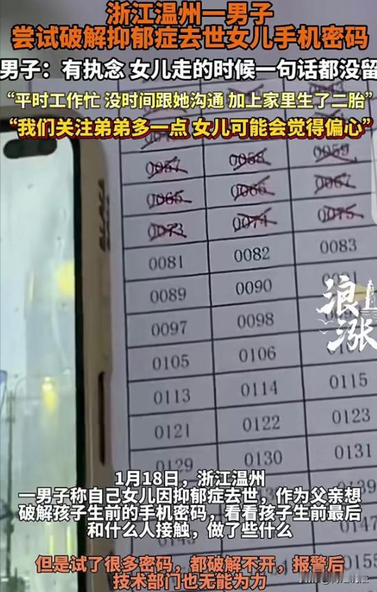 浙江温州,一男子受传统观念影响二胎追生儿子,大女儿却因觉得父母偏心弟弟,性情大变,被确诊双向情感障碍且有抑郁倾向。休学后病情愈发严重,最终因抑郁而离世,且没留下只言片语。男子反思后,想破解女儿手机密码,了解她生前接触的人和做的事,可试了很多密码都不行。网友却看不下去了,一句话揭露男子虚伪。 (来源:浪涨新闻) 老陈受传统观念影响,一直盼着能有个儿子,觉得儿子才是家族香火的延续,能给自己养老送终。大女儿出生时,他虽也高兴,但心里总有个结。 随着大女儿慢慢长大,老陈和妻子又怀上了二胎。十月怀胎,孩子呱呱坠地,是个儿子。老陈乐开了花,对儿子那是百般疼爱,要啥给啥。 家里好吃的,先紧着儿子;好玩的,也优先给儿子。大女儿看在眼里,心里渐渐有了变化。她开始觉得父母不再爱自己,自己在这个家成了多余的人。 大女儿原本是个活泼开朗的孩子,学习成绩也不错。可自从弟弟出生后,她变得沉默寡言,脸上很少再见到笑容。 在学校里,她也总是独来独往,不再和同学们一起玩耍。老师发现了她的变化,把情况告诉了老陈和妻子。可老陈觉得孩子就是闹脾气,过段时间就好了,并没有太在意。 日子一天天过去,大女儿的情况越来越糟。她开始失眠,整夜整夜地睡不着觉,白天上课也没精神。她对什么都提不起兴趣,曾经喜欢的画画、唱歌,现在都不想碰。 老陈和妻子这才意识到问题的严重性,带她去医院检查。医生诊断,大女儿患上了双向情感障碍,还有抑郁倾向。 老陈开始有些慌了,他没想到自己的偏心会给女儿带来这么大的伤害。他带着女儿四处求医,可女儿的病情却没有明显好转。 大女儿不得不休学在家。她整天把自己关在房间里,不吃不喝,也不说话。老陈和妻子看着女儿这样,心急如焚,却又无能为力。 他们试图和女儿沟通,可女儿总是对他们不理不睬。老陈有时会忍不住对女儿发脾气,怪她不争气,不懂事。可他不知道,他的这些话就像一把把刀子,深深地刺痛了女儿的心。 在一个寒冷的冬夜,大女儿还是没能挺过去。她静静地离开了这个世界,没有留下只言片语。老陈和妻子悲痛欲绝,他们无法接受这个残酷的现实。 他们抱着女儿的遗体,哭得昏天暗地。他们后悔自己当初的偏心,后悔没有好好关心女儿,可一切都已经太晚了。 女儿走后,老陈陷入了深深的自责和痛苦之中。他总觉得女儿的死和自己有关,他想知道女儿生前到底经历了什么,是什么让她走上了绝路。 他想起女儿有一部手机,里面或许藏着答案。 于是,他开始尝试破解女儿的手机密码。他试了女儿的生日、自己的生日、妻子的生日,还有各种可能的组合,可都不对。 老陈无奈之下,只好报了警。民警来了之后,也尝试了很多方法,但还是无法破解手机密码。老陈觉得自己离真相越来越远了。 这件事,大多数网友都指责老陈虚伪,说他女儿生病的时候,他没有好好陪伴,没有给予足够的关心和爱护,现在女儿走了,却想通过破解手机密码来寻找外界原因,安慰自己,这根本就是自欺欺人。 也有一部分网友觉得老陈也挺可怜的,他可能也是受到了传统观念的影响,并不是故意要偏心儿子,忽视女儿。他现在已经很后悔了,大家应该给他一些理解和宽容。 从法律层面来看,老陈作为大女儿的监护人,有义务保障女儿的身心健康。 根据民法典规定,父母对未成年子女负有抚养、教育和保护的义务。老陈重男轻女,对女儿缺乏关爱和照顾,导致女儿患上精神疾病。 这老陈真是糊涂至极,重男轻女这种老观念早该扔进垃圾桶了。孩子都是自己的骨肉,哪能厚此薄彼? 女儿生病的时候不重视,走了才来后悔,现在想找借口安慰自己,有什么用? 做父母的就得一碗水端平,不然害了孩子,自己也得一辈子活在愧疚里。 对此,大家都怎么看呢,是觉得老陈情有可原,还是觉得他罪有应得,一起来讨论一下吧!