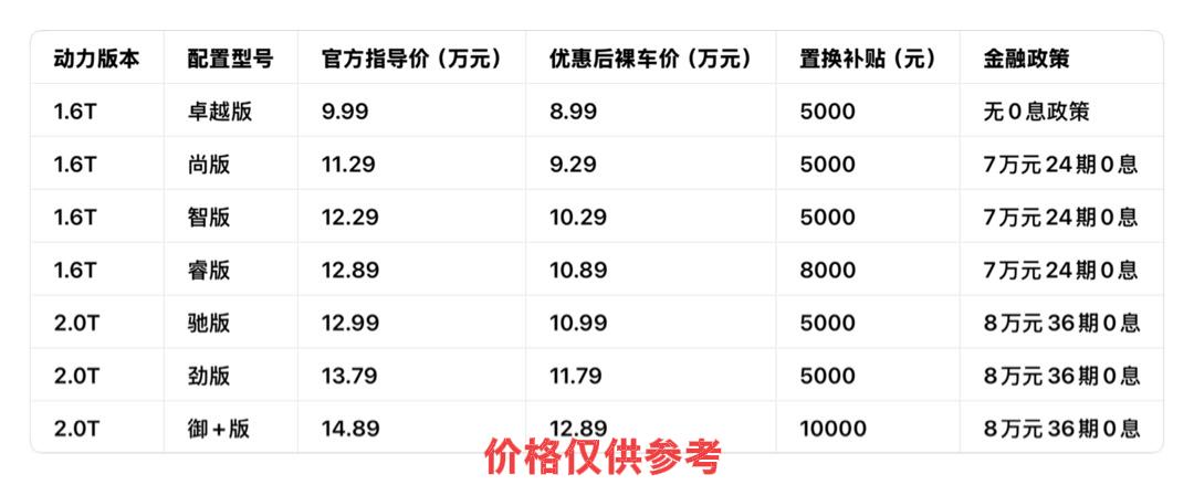 最近打算入手家用轿车,特意去多家门店了解了奇瑞艾瑞泽8的最新行情,发现这款车的价格体系和优惠政策都比较清晰,对于普通消费者来说选择空间也足够大。结合实际咨询到的信息,和大家详细聊聊它的价格现状和购车权益。 ⬇️⬇️⬇️ 艾瑞泽8目前在售的2025款车型分为1.6T和2.0T两种动力版本,官方指导价区间在9.99万到14.89万之间。其中1.6T车型有四个配置,从入门的卓越版到顶配的睿版,价格依次为9.99万、11.29万、12.29万和12.89万;2.0T车型则有三个配置,驰版、劲版和御+版的指导价分别是12.99万、13.79万和14.89万,整体价格跨度合理,能满足不同预算需求。 ⬇️⬇️⬇️ 现金优惠方面,目前市场上的力度比较统一,除了入门的1.6T卓越版优惠1万元,裸车价8.99万起之外,其余车型普遍能享受到2万元的优惠。比如1.6T智版指导价12.29万,优惠后裸车价10.29万;2.0T主力车型驰版优惠后10.99万,顶配御+版优惠后12.89万,这个优惠幅度让整车的性价比提升不少。 ⬇️⬇️⬇️ 置换补贴是另一项实用的权益,不同配置车型的补贴力度有差异。尚版、智版、驰版和劲版能享受5000元置换补贴,睿版补贴8000元,顶配御+版的置换补贴最高可达1万元,对于有旧车置换需求的消费者来说,能进一步降低购车成本。 ⬇️⬇️⬇️ 金融政策也比较灵活,1.6T的尚版、智版、睿版支持7万元24期0息贷款,2.0T的驰版、劲版、御+版则可以享受8万元36期0息。以2.0T御+版为例,优惠后裸车12.89万,首付4.89万,剩下的8万元分36期还款,每月只需支付2222元,没有利息压力,对预算有限的年轻消费者很友好。 ⬇️⬇️⬇️ 购车时还需要考虑购置税和保险费用,以入门的1.6T卓越版为例,优惠后裸车8.99万,购置税约8000元,保险费用大概5000元左右,全款落地价基本能控制在10万元以内。不同购车渠道的价格也有细微差异,4S店价格透明,能享受原厂终身质保和24小时道路救援等服务,综合汽贸店的保险费用可能更灵活,但需要仔细核实车辆来源和售后保障。 ⬇️⬇️⬇️ 整体来看,艾瑞泽8的价格行情稳定,优惠政策务实,没有复杂的捆绑条件。无论是追求性价比的入门用户,还是注重动力和配置的中高配消费者,都能找到合适的选择。建议购车前多对比几家门店的报价,结合自身是否有置换需求和还款偏好,选择最划算的购车方案。 (内容仅供参考,具体详情请咨询当地经销商)【来自懂车帝车友圈】