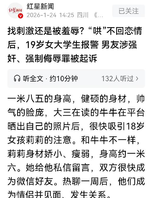 南宁西塘,19岁的大一女生,网上认识帅气的大三男生,网聊一周,见面并发生了关系。男生在校外租了公寓,女生常住。男生发现女友劈腿要求分手,女生舍不得分,接受男生惩罚,烟头烫、吞痰液、排泄物。后女生发现仍无法挽回感情,再一次发生关系后,报警称被强奸。男生被抓,称两人玩的是情侣之间的游戏,是自愿没有强迫。女生在接收男生家长7万赔偿金后,出具谅解书,但男生仍面临刑责。 这事儿发生在南宁西乡塘区,主角是两个大学生,19岁的大一女生莉莉和22岁的大三男生牛牛。两人既不是同学介绍,也不是线下偶遇,全靠抖音牵线——莉莉刷到牛牛的视频,觉得他长得帅、身材好,主动发私信搭讪,加了微信后热聊一周,就确定了恋爱关系,见面当天就发生了性关系。 之后莉莉干脆搬到了牛牛在校外租的公寓,两人像小夫妻一样同住,一开始相处得还算融洽,一起逛街吃饭,没闹过什么矛盾。 莉莉说牛牛挺照顾她,自己慢慢就有了情感依赖;牛牛也承认,热恋期的时候两人没什么分歧,关系很稳定。可这份仓促开始的感情,终究经不住考验,裂痕很快就出现了。 2025年3月16日,牛牛在出租屋里发现莉莉跟别的男生网聊,当场就发了火,直接提了分手。莉莉舍不得这段感情,觉得是自己不对,一门心思要挽回。 她怎么也没想到,牛牛所谓的“原谅”,竟是一系列极端的惩罚——逼着她吞自己的痰液、排泄物,扇她耳光,还用烟头烫她的手臂、后背。 莉莉全都照做了,她后来回忆,当时就想着认错赎罪,能留住牛牛就行,哪怕受点委屈也认。 可这些卑微的妥协,并没换来牛牛的回心转意。3月19日莉莉再去出租屋时,又被牛牛用烟头烫;23号晚上,同样的侮辱和伤害再次发生,甚至变本加厉,烟头烫到了她的大腿内侧和胸部。 更荒唐的是,24号凌晨,两人还去了纹身店,莉莉在手臂上纹了只小狗,配文“牛牛’S”,意思就是自己是“牛牛的狗”,把姿态放得极低。她以为做到这份上,牛牛总能消气,可牛牛转头就告诉她,自己认识了新女生,还一起逛了街。 到这时候,莉莉才彻底明白,这段感情根本挽不回了。她为了留住对方,忍受了常人无法想象的羞辱,换来的却是对方的冷漠和新欢。 24号晚上到25号凌晨,牛牛又逼着她吞秽物、扇耳光,之后两人睡在了一起。25号下午,两人再次发生性关系,莉莉离开出租屋没多久,就下定决心报了警,说自己被强奸了。 警方很快把牛牛抓获,可他却一口否认强奸,说这都是情侣间的“玩法”。 牛牛辩解,他和莉莉是模仿网上的SM游戏,追求性刺激,不管是吞痰液、被烟头烫,还是发生性关系,莉莉都是自愿的,甚至扇耳光都是互相的,莉莉喊停他就会停。 他觉得莉莉报警就是“因爱生恨”,是得不到就想毁掉他,还说自己故意提新女生刺激莉莉,就是想让她彻底放手。 双方各执一词,证据就成了关键。牛牛的母亲找来了楼道和电梯监控,画面里两人进出时还有说有笑,牛牛还搂着莉莉,看不出莉莉有被胁迫的样子,这成了牛牛一方的重要依据。 可莉莉反驳,那些顺从都是装的,她怕反抗会遭到更严重的伤害,而且2025年3月16号之前,两人的性行为都是正常自愿的,之后的所有行为,都是为了挽回感情才被迫配合,内心早就充满了抗拒。 警方还查到,莉莉手臂上的纹身、身上的烫伤痕迹,都能印证她遭受过侮辱和伤害。 案子走到检察院后,牛牛的家人急了,毕竟牛牛还在读大三,一旦定罪,前途就毁了。他们主动找莉莉协商,给了她7万元赔偿金。莉莉收了钱,出具了刑事谅解书,明确表示不再追究牛牛的民事和行政责任,恳请司法机关从轻处理,给牛牛改过自新的机会。 但大家都清楚,刑事案件不是被害人谅解就能撤销的,这7万和谅解书,顶多能在量刑时起到减轻作用,不能让牛牛免于刑责。 南宁市西乡塘区检察院经过审查,不仅以强奸罪起诉牛牛,还加了一个强制侮辱罪。警方调查认定,2025年3月16号到25号期间,牛牛以分手为要挟,用暴力手段逼迫莉莉接受侮辱、发生性关系,已经触犯了刑法。 这案子还被退回侦查机关补充侦查过两次,可见案情的复杂性。这里要明确一点,情侣关系根本不是免责理由,哪怕之前有过自愿性行为,也不代表一方能强迫另一方,性同意必须是实时、明确的,违背对方意志就是犯罪。 说到底,这事儿没有赢家。莉莉才19岁,刚上大学,为了一段草率的网恋,不仅付出了身体和尊严的代价,还留下了一辈子的心理阴影。 她以为妥协能留住爱情,却不知道底线一再退让只会让自己受更深的伤。而牛牛,原本有光明的前途,却因为极端的控制欲和变态的发泄方式,把自己送进了法网,即便有谅解书,也大概率要面临牢狱之灾,学业、未来全被自己毁了。 这案子也给所有人提了个醒:网上交友别太草率,刚认识一周就发生关系、同居,本身就埋下了隐患。感情里不管多爱,都不能丢了底线,接受侮辱性惩罚换不来爱情,只会换来轻视和伤害。