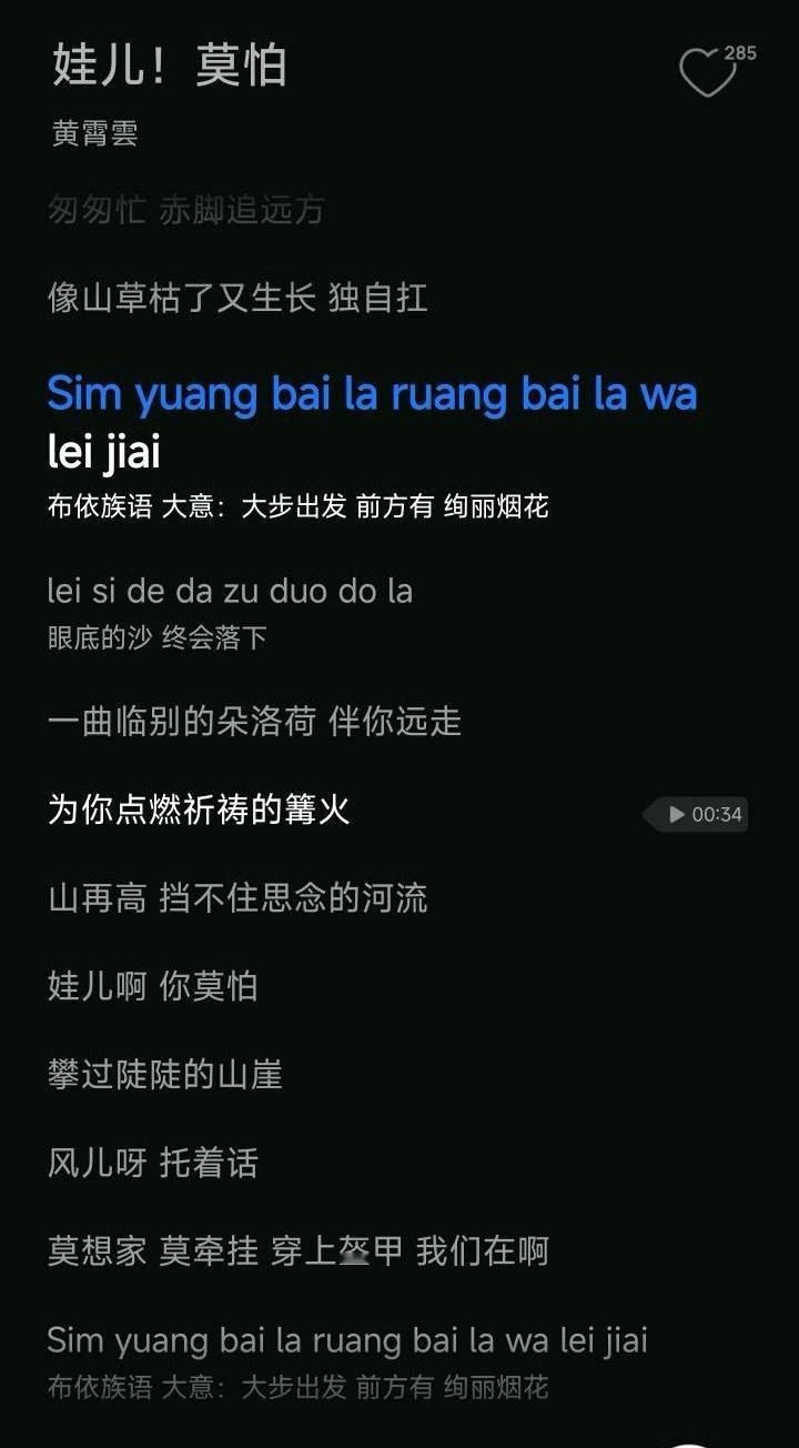 黄霄雲把布依族方言唱进新歌里黄霄雲新歌抱过小时候的我,这首《娃儿!莫怕》太有力量了!把布依族方言融进旋律里,民族腔调碰撞流行乐,唱尽乡愁与追梦勇气。