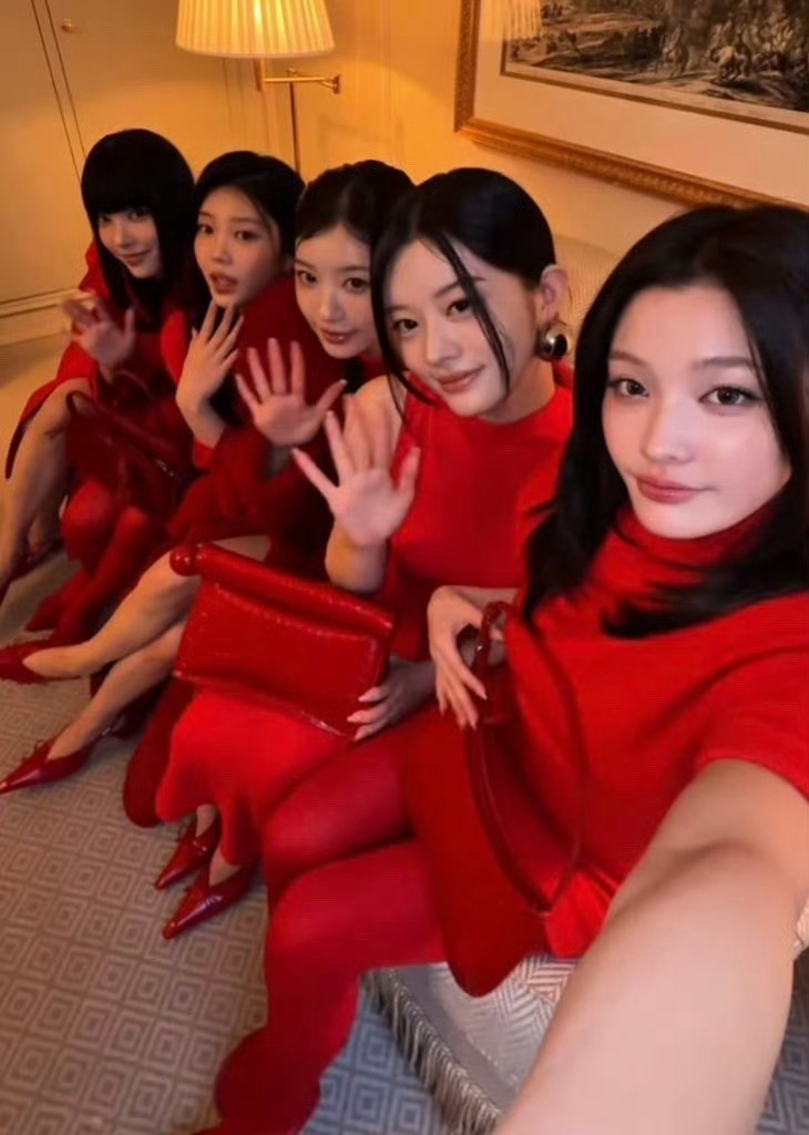 ILLIT巴黎时装周全员红裙ILLIT亮相巴黎时装周 全员红裙好特别的造型!!五个人都是本命年吗哈哈哈哈