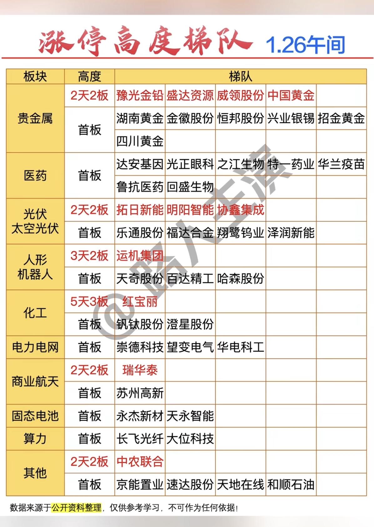 1.26周一 涨停板股票:梯队高度! 贵金属 10 股涨停 医药 7股涨停 太空光伏 7股涨停 化工原料 3股涨停 电力电网 3股涨停