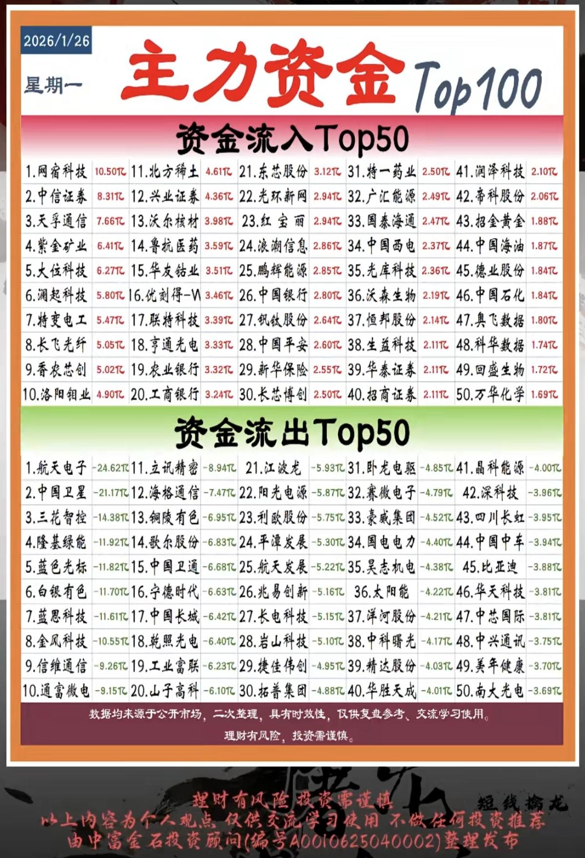 1.26周一 主力大资金 抢筹出逃个股榜! 工业金属,黄金白银,银行保险证券大金融,算力租恁,盐湖提锂等,获得资金关注。 军工装备,租售同权,白酒,赛马,光刻机,存储芯片,半导体等资金出逃