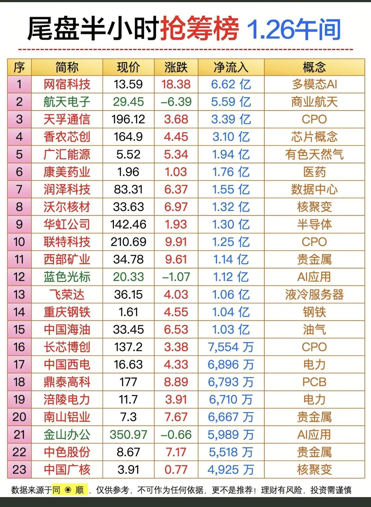 1.26周一 主力资金 尾盘抢筹 个股榜! 尾盘半小时抢筹,主力净流入 大金融,化工原料,环氧丙烷,钙钛矿电池,燃气页岩气,通信服务,贵金属等资金流入较多。