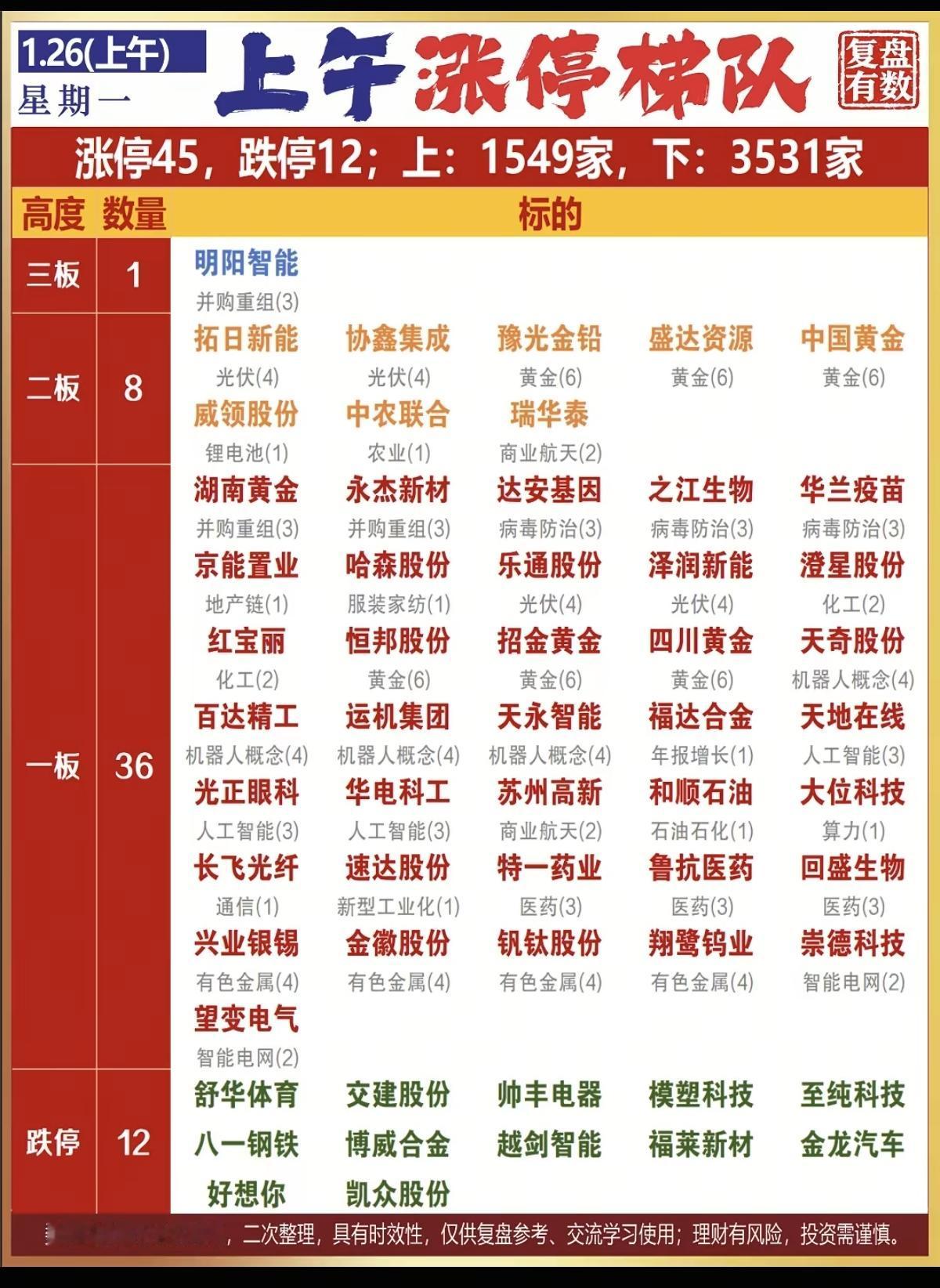 1.26周一 涨停板股票:复盘统计! 贵金属,光伏,化工,疫苗 涨停板45家,跌停12家 涨跌比1549:3531 焦点:光伏,黄金白银,病毒防治,化工