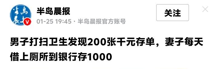 江苏宿迁惊现“厕所理财女王”!90后妻子借如厕之名日存千元,两年暗攒20万存单引爆全网勤俭风暴 当你还在为每月月光发愁时,有位妻子已把厕所变成了家庭金库的秘密通道。江苏宿迁的苏先生大扫除时,竟翻出妻子藏在记事本里的近200张千元存单,整整二十万元现金如砖块般整齐排列。这对90后夫妻经营着小本生意,收入按日结算,而妻子从去年八月起,每日借“上厕所”之机溜进隔壁银行,雷打不动存进1000元。 这哪是普通如厕?分明是一场精心策划的“财富突围战”。在移动支付席卷生活的今天,她坚持手握现金穿越街头,将易逝的流水收入铸成沉甸甸的存单。丈夫笑着调侃“咱有这觉悟”,背后却藏着一份夫妻间心照不宣的温柔——我不问你的秘密,你守护我们的未来。 网友炸锅了。有人算账惊呼“每天余千元,生意得多旺?”有人质疑“银行天天排队,她哪来时间?”更有人调侃“柜员怕不是在她家厕所蹲点办公”。喧嚣争议中,一个真相浮出水面:这不仅是储蓄,更是一场对抗消费洪流的沉默仪式。 在扫码支付一秒清空钱包的时代,现金存单像一枚枚时间胶囊,锁住辛劳与克制。她存的何止是钱?是早餐摊的晨雾、夜市灯的微光,是每一笔生意里捏出汗的零碎钞票。这种“土法理财”看似笨拙,却狠狠戳中现代人的焦虑——数字账户的钱如流沙,而纸质存单是能摸到的安全感。 年轻人总叹“存钱难”,她却用最质朴的方式给出了答案。没有高深理财经,只有日复一日的坚持;没有抱怨收入薄,只有“钱在手里就想花”的清醒对抗。这摞存单照见的,是普通人对抗物欲的微型史诗,是夫妻并肩作战的浪漫契约。 风暴眼的妻子依然沉默。她或许不知自己已成“民间理财偶像”,但千千万万为家庭攥紧拳头的人,已从她身上看见光——财富不在宏大叙事中,而在厕所到银行的那一百米路上,在每一天不肯妥协的积累里。 如今全网都在追问“她究竟做什么生意?”但比答案更重要的,是那份把日子过成金子的决心。当浮华喧嚣褪去,真正撼动人心的,从来不是暴富神话,而是这般细水长流的坚韧。你的生活里,是否也藏着这样一个“秘密金库”? (来源:半岛晨报) 家庭理财 90后夫妻