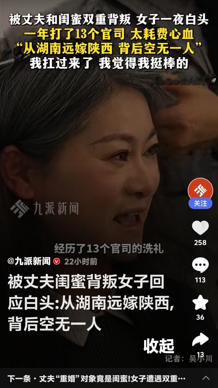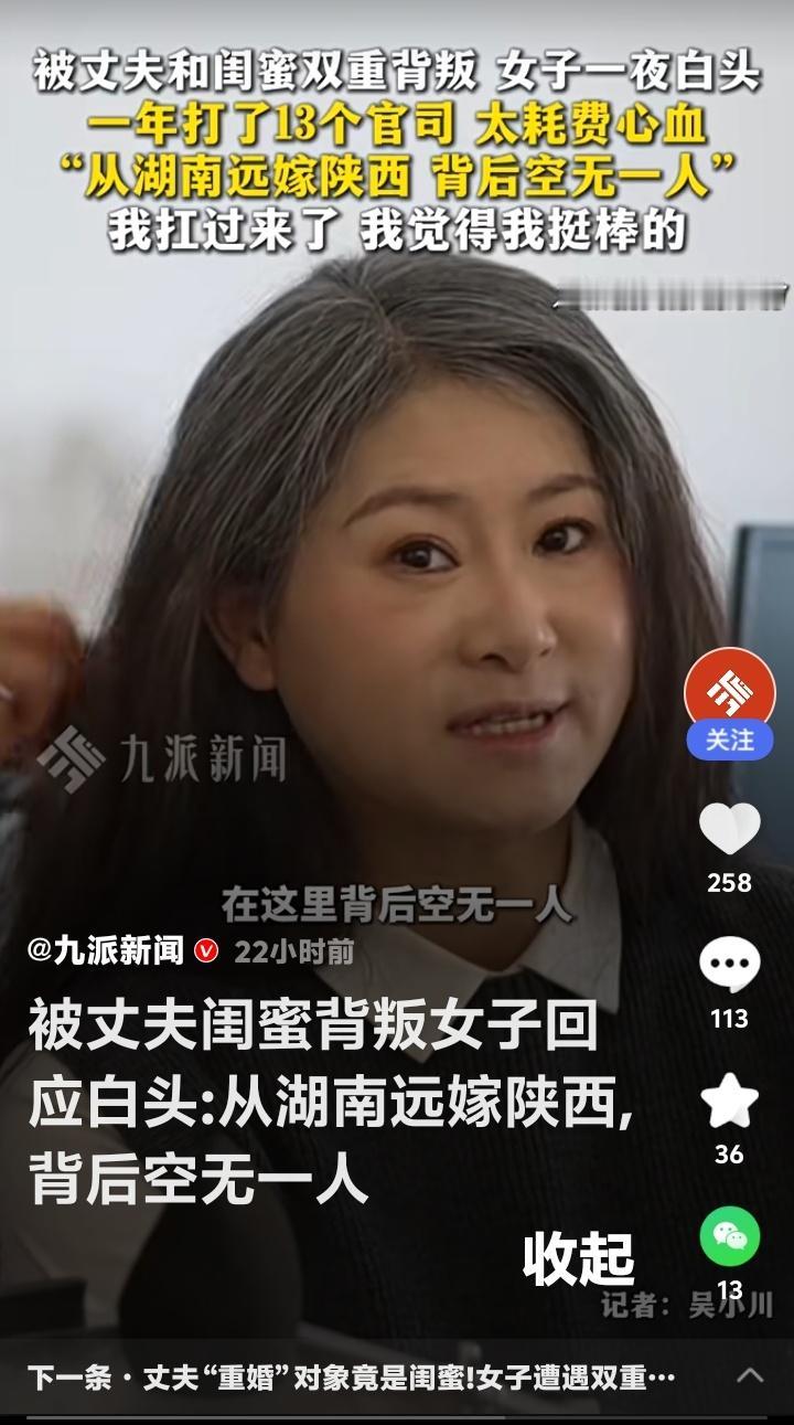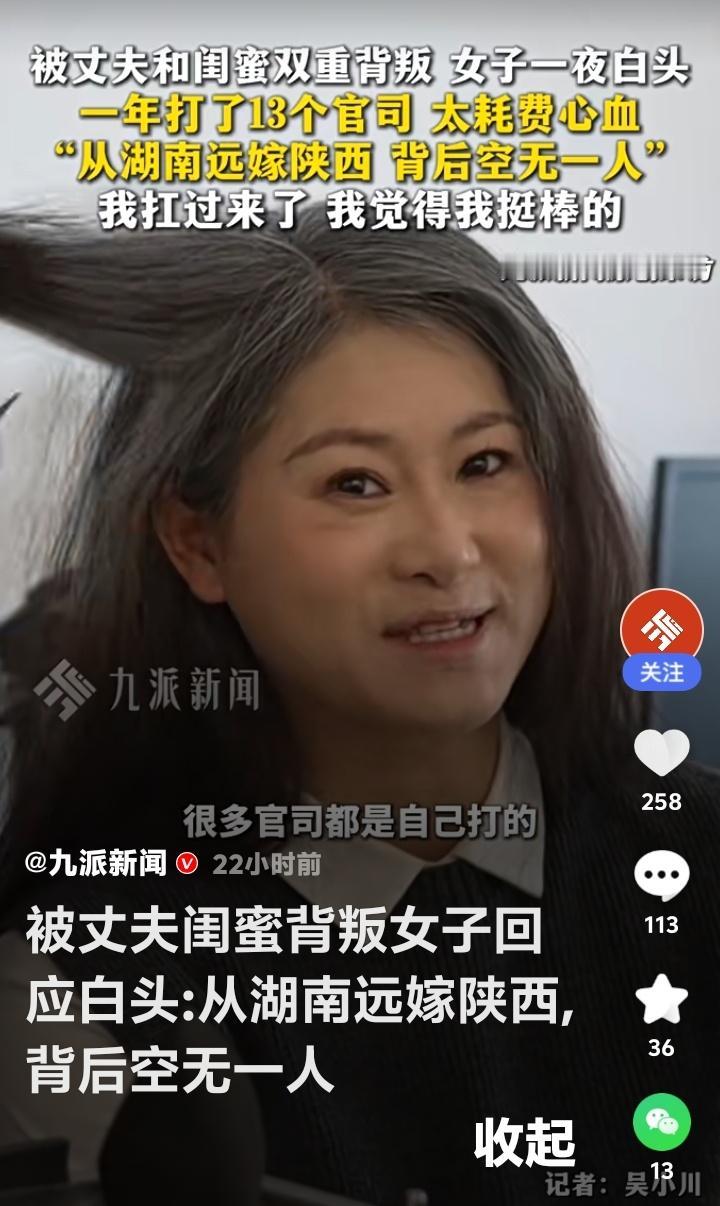 湖南远嫁陕西女子遭丈夫闺蜜双重背叛一夜白头,13场官司血泪实录:我背后空无一人,但扛过来了! 当镜子里的青丝一夜间覆上寒霜,她才真正看清这场婚姻的真相。那不是命运的玩笑,而是最信任的两个人联手捅向心脏的刀。从湖南到陕西,千里奔赴的爱情,最终沦为法庭上堆积如山的证据和整整十三场官司的硝烟。 所谓闺蜜,是那个听过你所有深夜哭诉的人,也是那个悄悄拿走你枕边人钥匙的人。所谓丈夫,是承诺要为你遮风挡雨的人,也是亲手把风雨引入你人生的人。双重背叛撕裂的不仅是婚姻,更是人对人性最基本的信任。 整整一年,她不是在法庭,就是在去法庭的路上。十三场官司,像十三场凌迟,耗费的何止是金钱时间,更是一个女人对世界全部的热情。每一份诉状,都是把结痂的伤口再次撕开,向陌生人展示里面的血肉模糊。 从湖南远嫁他乡的那一刻,她就切断了所有退路。当风暴来临,身后空无一人。父母远在千里,朋友圈子早已因婚姻而疏远。深夜抱着法律条文痛哭的,只有她自己。但正是这绝境,逼出了骨子里连自己都未曾察觉的坚韧。 有人问她恨吗?她说,白头就是答案。但恨不是终点,她选择在废墟上重建秩序。一笔笔转账记录,一条条暧昧信息,她冷静地整理成证据。感情输了,但公道必须讨回来。她要让所有人看到,背叛是有代价的。 陕西省安康市中级人民法院的二审判决书,终于为这场战役画下句点。第三者被判决全额返还四万余元赠与财产。这不仅是钱的胜利,更是一个信号:法律终究会为底线兜底。尽管重婚罪的认定依然艰难,但这微小的胜利,足以照亮无数类似处境女性的前路。 如今她站在镜前,抚摸着一头刺眼的白发,平静地说:“我扛过来了,我觉得我挺棒的。”这头白发,不是衰老的印记,而是战士的勋章。它记录着背叛的寒冷,更闪耀着重生的光芒。从依赖他人到依靠自己,她完成了一场惊心动魄的人格独立。 她的故事像一面镜子,照见人性中最幽暗的角落,也折射出人性最坚韧的光芒。它告诉我们,即使背后空无一人,你还可以做自己最后的靠山。这个世界或许会让你失望,但你不能让自己失望。每一个从深渊爬出来的人,都是自己的英雄。 (来源:根据九派新闻原创采访报道及陕西省安康市中级人民法院公开庭审信息综合撰写) 婚姻背叛 女性成长