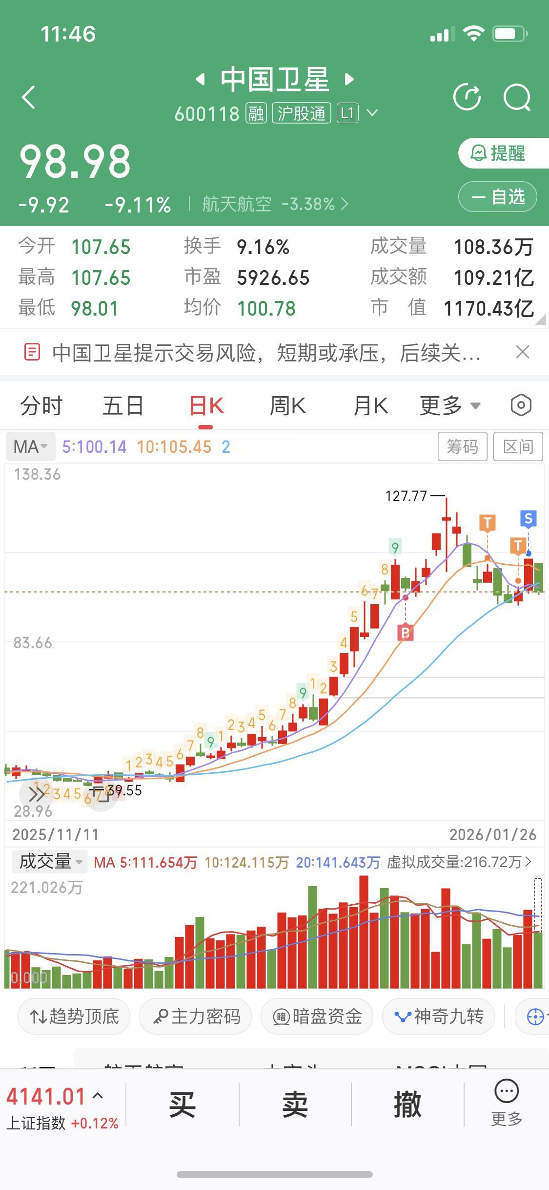 上周我在102.8卖掉中国卫星的时候,心里还直打鼓,生怕卖飞了,那感觉就像放走了一只煮熟的鸭子。结果今天一看,好家伙,股价直接跌到了98,还下跌了9个点。这就跟坐过山车似的,还好我提前跳了下来。 股票这东西真是让人捉摸不透,原本以为卖亏了,没想到躲过了一劫。看来有时候果断出手也没错,不然这会儿估计得为账面的亏损愁死。以后还是得稳着点,别被一时的涨跌乱了阵脚。