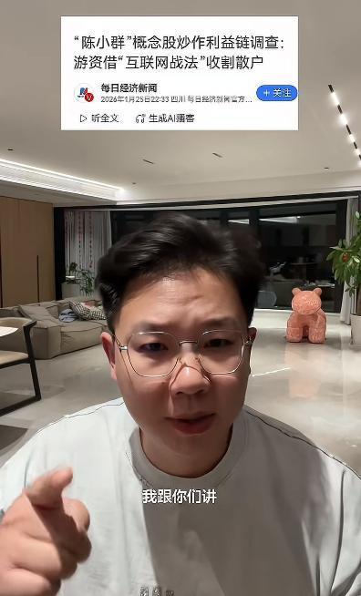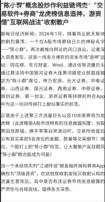 陈小群上新闻了!某某新闻提到,陈小群概念股利用互联网战法收割散户,让股民大量跟风!自从海格大单一字跌停后,陈小群的名声就彻底臭了!周五他依然出现在了通宇的榜上,但商业航天却集体大跌,很显然,市场有市场的走法,单靠陈小群一个人是没用的,虽然有时候有席位溢价,但最终还是会被反噬。目前他的票已经没人跟风,无论溢价多牛,都没办法与市场作对。 每年1月,都是比较难做的一个月,还是管住手,保住本金最重要啊!