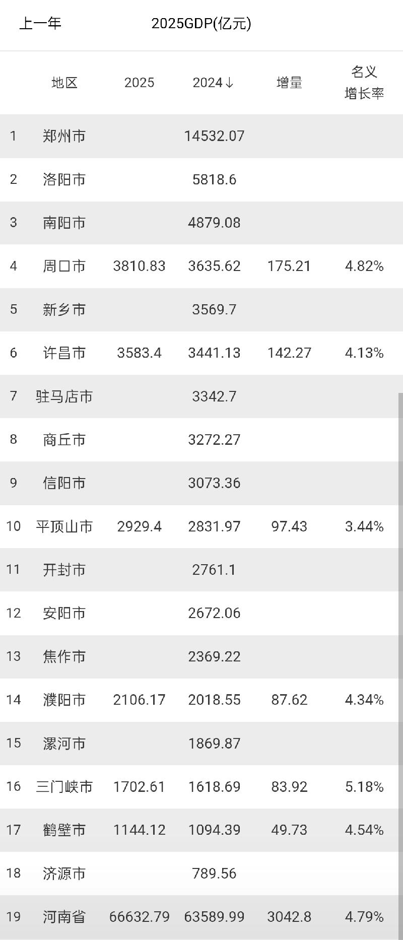 河南6个城市2025年GDP出炉:周口许昌差距扩大、平顶山未能超过3000亿、鹤壁增量垫底 河南省是我国中部经济第一大省、全国经济第6大省,2025年全省GDP实现66632.79亿,较2024年增加了3042.8亿,名义增长4.79%,截止目前,河南省已有6个城市2025年GDP数据出炉了,三门峡名义增速最高,平顶山名义增速垫底。 周口和许昌2025年GDP分别实现3810.83亿和3583.4亿,较2024年分别增加了175.21亿和142.27亿,许昌经济增量低于周口,导致与周口的经济差距扩大至227.43亿。 平顶山2025年GDP总量未能突破3000亿,实现2929.4亿,位居全省第10名;濮阳实现2106.1亿。 三门峡和鹤壁分别实现1702.61亿和1144.12亿,较去年增加了83.92亿和49.73亿,鹤壁经济总量与增量在已出炉城市中都处于垫底。