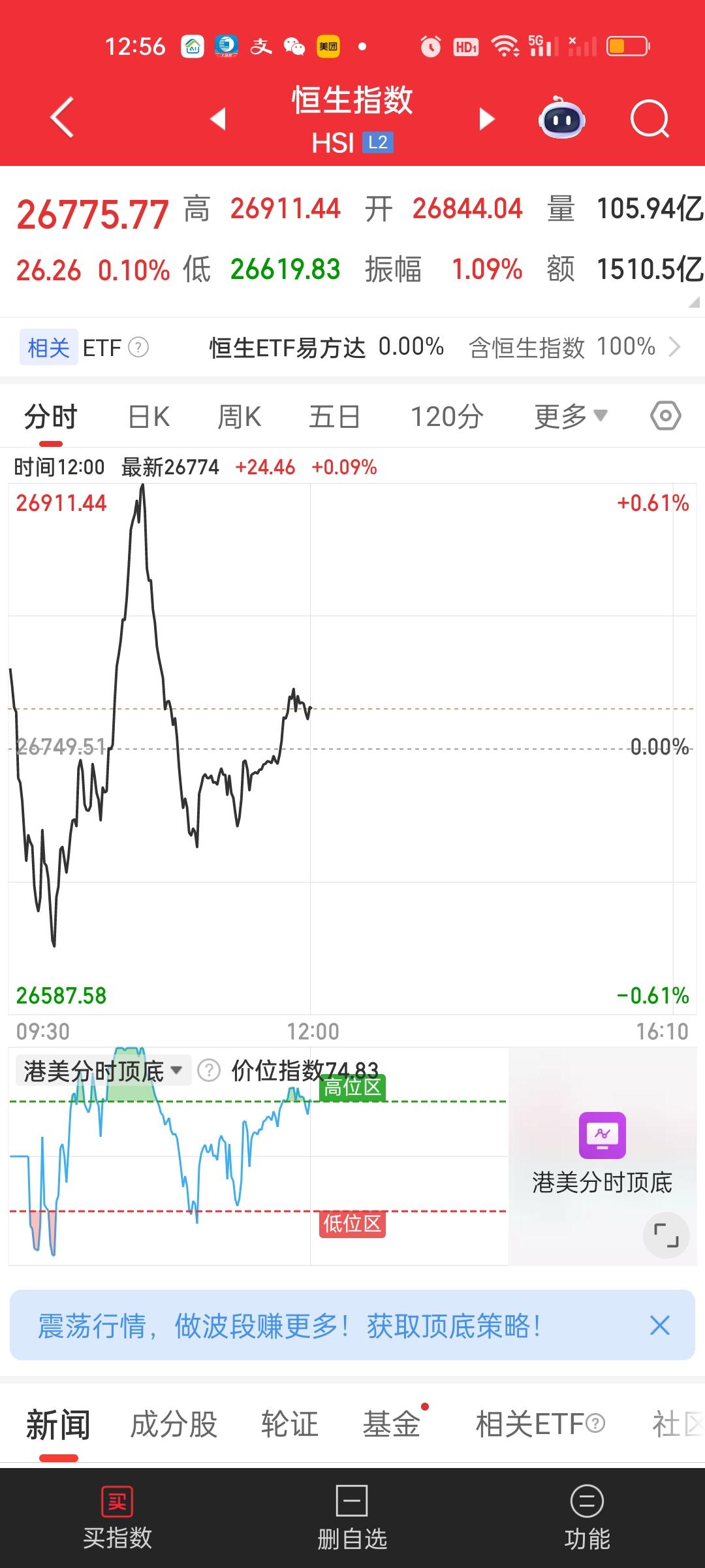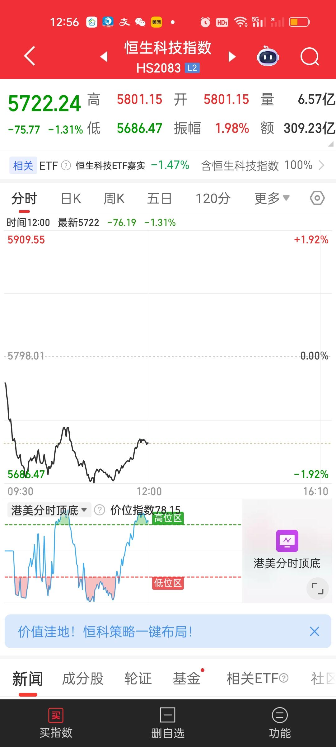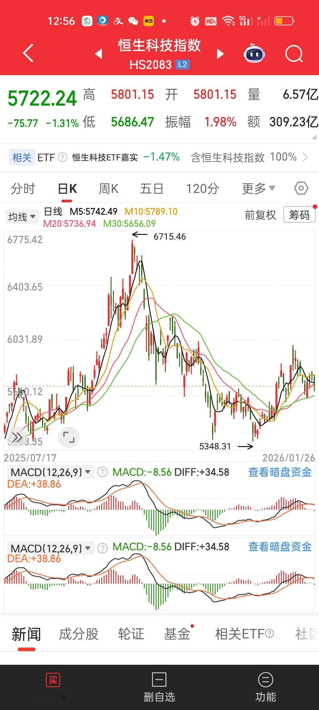 港股今天也走的极其不稳定,指数也在上蹿下跳,但截止中午收盘,恒指依旧收在所有均线的上方,恒科走的相对疲软,5日10日20日线全部跌破,只剩下30日线一道支撑。现在的走势太疲软,尽管不会有太大的风险,但年前可能也没有太好的机会了。