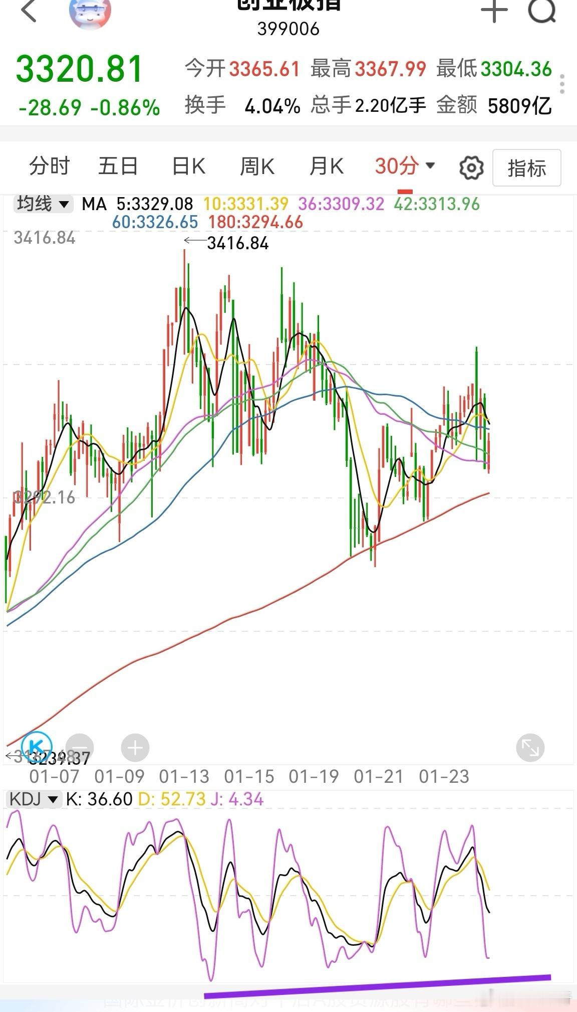 创业板3306这里会撑一两天至少,半小时kdj已经到超卖区,说明短期回调空间有限。半小时一般看的是未来6—12个半小时,差不多1—2天。慢牛节奏,创业板慢慢会去3088附近。现在的利空就是“有意降温”,这样超短线节奏会被打破,追高就需要三思。追涨和追高有很大区别,追涨不代表追高。高位往往是短期大涨30%以上,这种就需要三思,刻意打压的话,容易大跌。