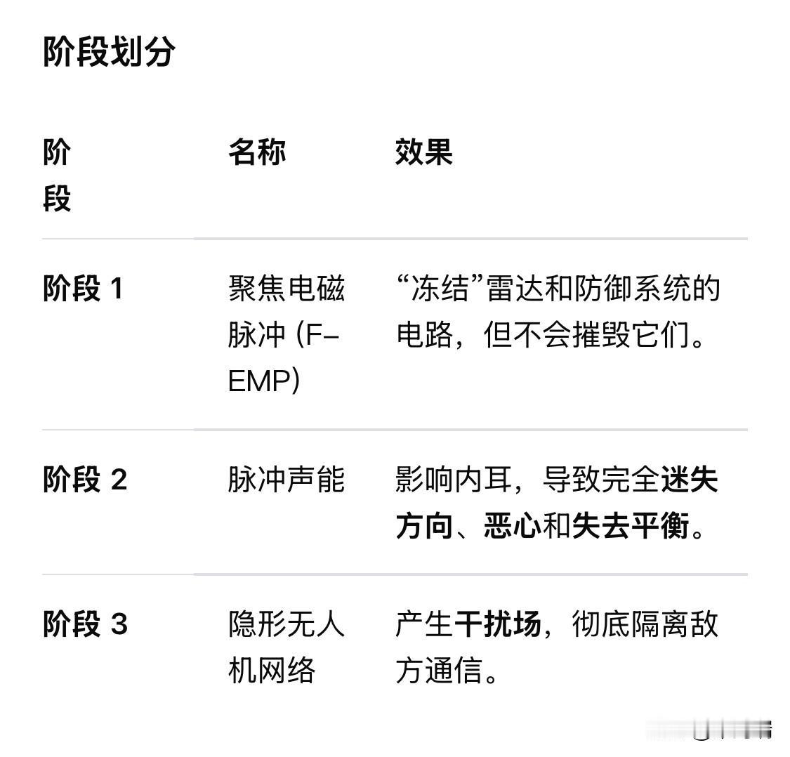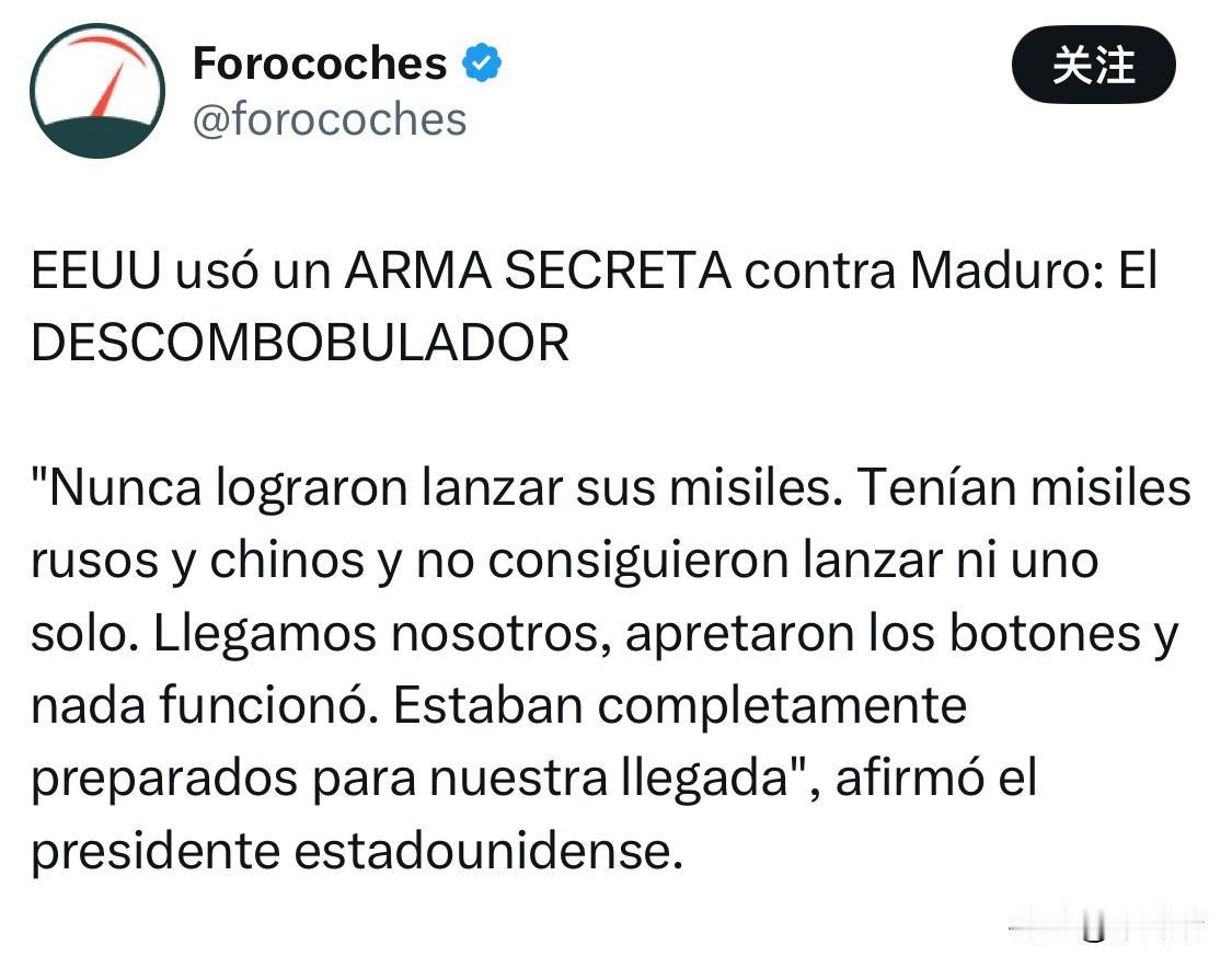 美国三角洲特种部队对马杜罗使用了一种秘密武器:解离器(El Descombobulador) 特朗普透露了一些这方面的信息,“他们根本没能发射导弹。他们有俄罗斯和中国的导弹,但一枚都没能发射出去。我们到了,他们按下按钮,但什么都没发生。他们对我们的到来做好了万全准备。” 所谓 El Descombobulador是一种秘密武器,采用“隐形战争”的概念,通过分三个阶段操纵电磁频谱和神经系统来使敌人完全丧失能力。 主要信息 武器名称:El Descombobulador(“解离器”)。 概念:一种通过使敌人的生物和技术能力失效来赢得战斗的“隐形战争”新时代武器。 操作方式:通过结合多种技术来实现完全瘫痪。