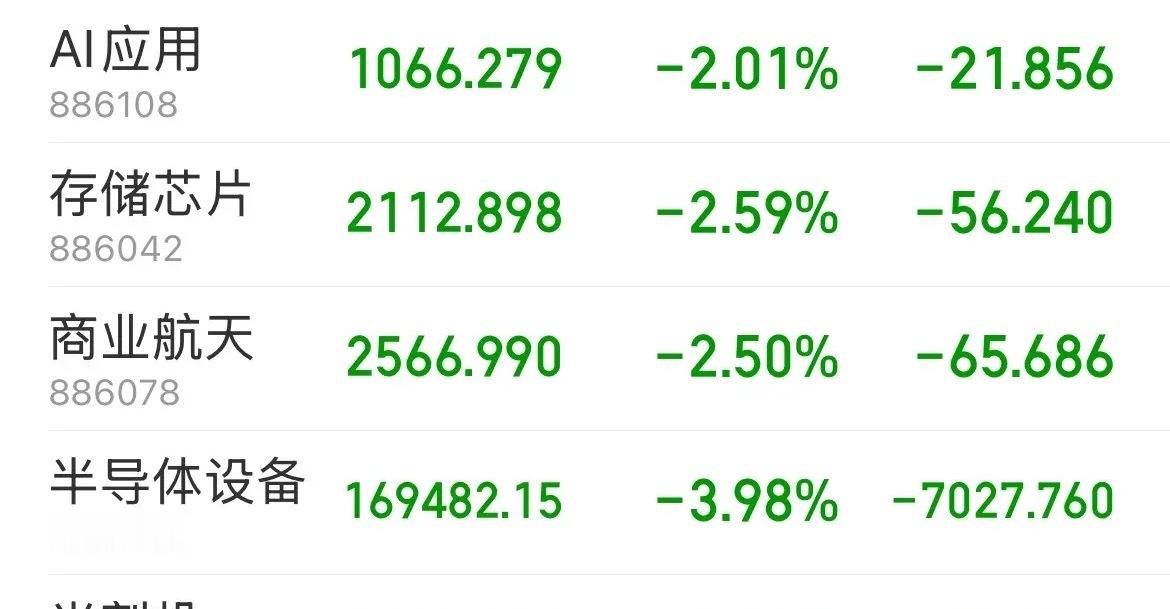 血洗一波,商业航天、半导体设备、存储芯片、AI应用全线跌幅超2%,周末满屏利好,开盘直接清洗,杀的太狠了猜中了开头,却没有猜中搞这么多,现在是一热就得往死里按一下,直接按趴下了,本来是半导体、商业航天轮动,现在主力直接掀桌子了,直接把周五追高的埋进去了,指数没有怎么跌,热门个股跌的稀里哗啦的,AI应用跌幅2%,商业航天跌幅2%,半导体设备跌幅3%,存储芯片跌幅2%,今天又是一个少亏就是赢的剧情了。今日看盘