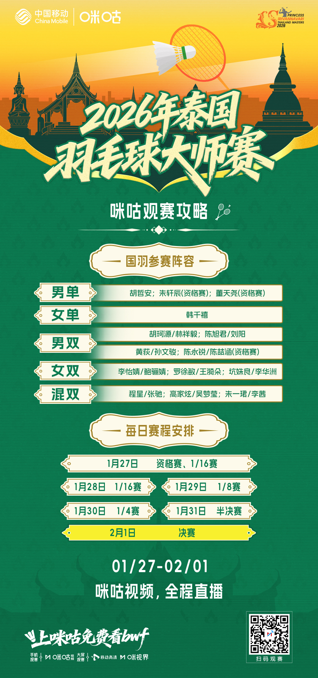 2026泰国羽毛球大师赛 即将开赛📚 咪咕赛程攻略已送达🇨🇳 国羽小将蓄力起航📅 1月27日-2月1日📱#上咪咕免费看BWF# 网页链接